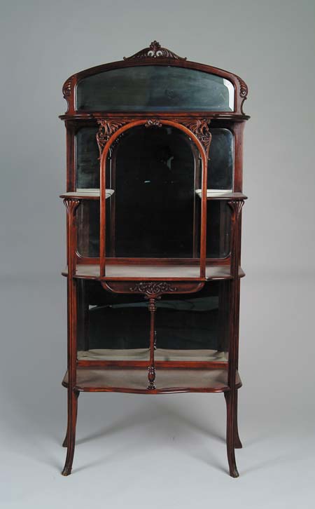 MAHOGANY MIRROR BACK CURIO SHELF. Small size having multiple open shelves with central alcove decorated with carved lions having a large beveled edge mirror. Nicely carved backsplash has similar mirror as well as the bottom shelf. All is supported by four tall curving legs, which are extensions of shelf supports. SIZE: 62-1/2” h x 27-1/2” w x 13-1/2” d. CONDITION: Very good. 5-69373 (500-1,000)