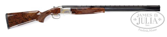 *BROWNING 325 GOLDEN CLAYS OVER & UNDER SHOTGUN. SN 37123NWC13. Cal. 12 ga. 30″ bbls, with ventilated target rib, dual white sighting beads, factory ported with invector plus chokes, 2-3/4″ chambers, ejectors and adjustable sgl selective trigger. Bbls are marked on left side “BROWNING ARMS COMPANY MORGAN, UTAH & MONTREAL P.Q./MADE IN JAPAN”, and right side “INVECTOR-PLUS CITORI SPECIAL STEEL 12 GA 2-3/4”. The gray receiver is embellished with foliate scroll, gold wire border and a scene in gold of a series of three quail transitioning into clay targets on left side. Bottom had two clay targets and “325” in gold. The right side has rising ducks transitioning through to two clay targets all in gold. Mounted with nicely figured walnut, checkered pistol grip, black recoil pad, and checkered schnable forend. Bore diameter: top -.741, bottom -.741. Bore restrictions: top -INV., bottom -INV. Wall thickness: top -.040, bottom -.041. Drop at heel: 2-1/4″, drop at comb: 1-7/16″. Weight: 7lbs. 12oz. LOP 14-3/4″ ADJ. Gun is accompanied with a factory accessories box that includes two choke tubes, choke tube wrench, and two replacement triggers, and allen wrench. CONDITION: Extremely fine. Gun appears to have very little use, bbls retain nearly all of their orig blue with a couple minor handling marks. Gray receiver is bright and clean. Stock is sound with a couple minor nicks, and very shallow scratches and retains nearly all of its orig factory finish. Checkering is sharp. Forend is sound with sharp checkering, a couple minor handling marks and retains virtually all of its orig finish. Mechanics are crisp, non-auto safety, strong ejectors and bright shiny bores. 4-39295 BDT9 (1,750-2,750)