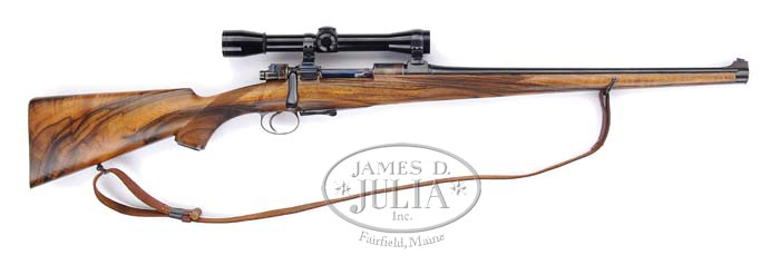 *CUSTOM K ACTION SQUARE BRIDGE MAUSER RIFLE BY M. SILVER WITH SCOPE. SN 1027. Cal. 7 x 57. This beautifully finished little rifle was inspired by the Mauser Type M carbine, w/ flat bolt handle, full length stock, and steel muzzle cap. 20″ Round bbl is engraved “M. Silver No. 1027” on top w/ wraparound front scope base stamped “7mm”. The Kurtz original Mauser action is case hardened, and has decorative file work on rear of receiver ring, and along left side of action. Square bridge has been fitted w/ ghost ring aperture sight adjustable for elevation w/ wing lock. Bolt has nicely filed blued butter knife handle. Case hardened bolt shroud has been fitted w/ Model 70 type safety. Custom bottom metal has hinged floor plate w/ lever release, and outline has been decoratively filed. Trigger guard bow has 2 beads. Timney trigger also has decorative file work. Bolt stop spring, extractor, and safety lever have been fire blued. Nicely streaked and figured English walnut full length stock measures 13-5/8″ over skeleton butt plate, and features nicely shaped, double shadow line, right hand cheek piece w/ ogee transition, case hardened steel grip cap, sling loop, front sling bail, nicely filed muzzle cap, and 22 LPI checkering in Holland style w/ mullered borders. Leupold M8 – 4X SCOPE w/ duplex reticle is in claw mounts fitted to rifle so that aperture sight can be used when scope is installed. Weight: 7 lbs 2 oz. Weight w/ scope: 8 lbs. PROVENANCE: Dr. Frank Miller Collection. CONDITION: Extremely fine. Bbl retains all of its blue. Action retains virtually all of its case color. Bottom metal retains all of its blue. Some scrapes on extractor. Stock retains nearly all of a hand rubbed oil finish w/ only one or 2 very slight marks. Bore is excellent. 4-35724 MGM120 (5,000-7,000)