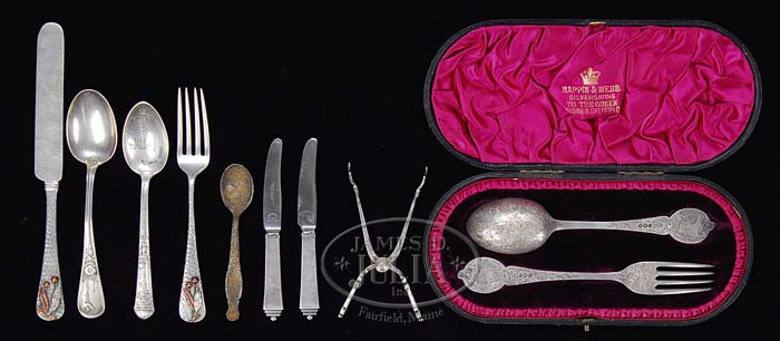 NICE LOT OF TEN MISCELLANEOUS PIECES OF STERLING FLATWARE. 1 & 2) Cased set of Mappin & Webb sterling 6″ spoon and fork. Monogrammed and decorated with flower vine. 3 & 4) Sterling and mixed metal hand hammered 6″ fork and 7-1/2″ knife by Gorham. Piece is marked “Sterling & Other Metals”. Hand hammered pieces have a decoration of cherry branch with two cherries in copper. 5) 5-3/4″ teaspoon by Tiffany & Co. advertising Du Pont with a man with gun trap shooting with clay pigeons. No monogram. 6) 5-1/2″ sterling 1939 World’s Fair commemorative souvenir spoon by Watson. 7 & 8) 4-1/2″ sterling handled Danish knives by George Jensen with hollow handles. 9) 4″ pair of George Jensen sugar tongs. 10) 1893 Colombian Exposition 4″ spoon, “as is”. WEIGHT: 7 tr. oz. CONDITION: As noted above, otherwise very good. 9-95640 (200-300)