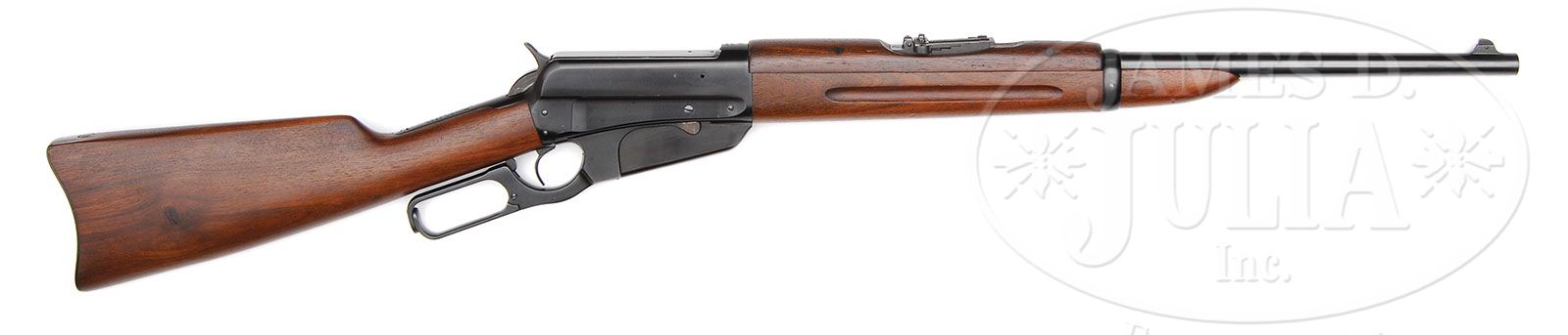 *WINCHESTER MODEL 1895 SADDLE RING CARBINE. SN 401959. Cal. 30 Army (30-40 Krag). Standard grade carbine with 22″ tapered rnd bbl, pedestal mounted front sight and 1,800 yard carbine/musket rear sight. Left side of receiver has a stud & ring. Mounted with very nicely figured, uncheckered, straight grain American walnut with straight stock and carbine/musket buttplate with trap containing a brass & cord pull-through jag & brush bore cleaning implement (unused). Forearm has grasping grooves with a single band and it also has an upper handguard. While the Model 1895 was produced in fairly large numbers (425,881) the majority of this model was made for the Russian Government (293,816) which leaves only 132,065 regular civilian models in a great variety of configurations, of which 10,000 were purchased by the U.S. Government. The Model 1895 carbine was produced in limited numbers, primarily in calibers 30-03, 30-06 & 303 British. Very few were made in 30-40 caliber. PROVENANCE: Robert C. Renneberg collection. CONDITION: Extraordinarily fine, probably unfired. The metal retains about 99% crisp orig blue with only a small fingernail-size spot on the bottom of the cartridge box which is slightly discolored; buttplate also retains about 99% orig blue with a few small scratches on heel & toe. The wood is near perfect and retains virtually all of its orig factory oil finish. Mechanics are crisp, brilliant shiny bore, appears to be new & unfired. 4-47717 JR262 (5,000-7,500)