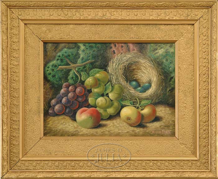 OLIVER CLARE (American, 1853-1927) STILL LIFE WITH ROBIN’S NEST. Oil on canvas scene shows a Robin’s nest with three eggs next to colorful fruit including apples, peaches and grapes. Signed lower right. Housed in a period gold gesso decorated frame with gold textured liner. SIZE: 10” x 14”. CONDITION: Very good. 9-70335 (2,000-3,000)