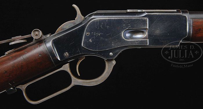 FINE WINCHESTER MODEL 1873 LEVER ACTION RIFLE. SN 292306. Cal 32 WCF. 24″ rnd bbl fitted with full magazine. Tang has long range graduated peep sight. Rear bbl dovetail has filler marked “Tilden Mfg. Co./Denver, Colo.” Front sight is combination style with brass bead. Rifle features a blued finish with case colored hammer, lever and buttplate. Rifle style stocks are of American black walnut with crescent steel butt. CONDITION: Bbl and receiver retain 80-85% orig blue with scratches and spots of wear or flaking. Hammer and lever have 50% lightly visible case colors. Buttplate finish has faded to silvery patina with areas of light pitting. Sound stocks have handling marks and scratches with small areas of peeling finish. Mechanics are smooth and crisp. Bore is slightly dark with areas of very light pitting. 4-41524 DS33 (4,000-6,000)