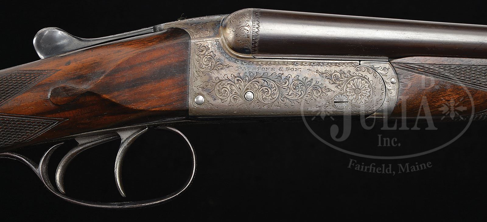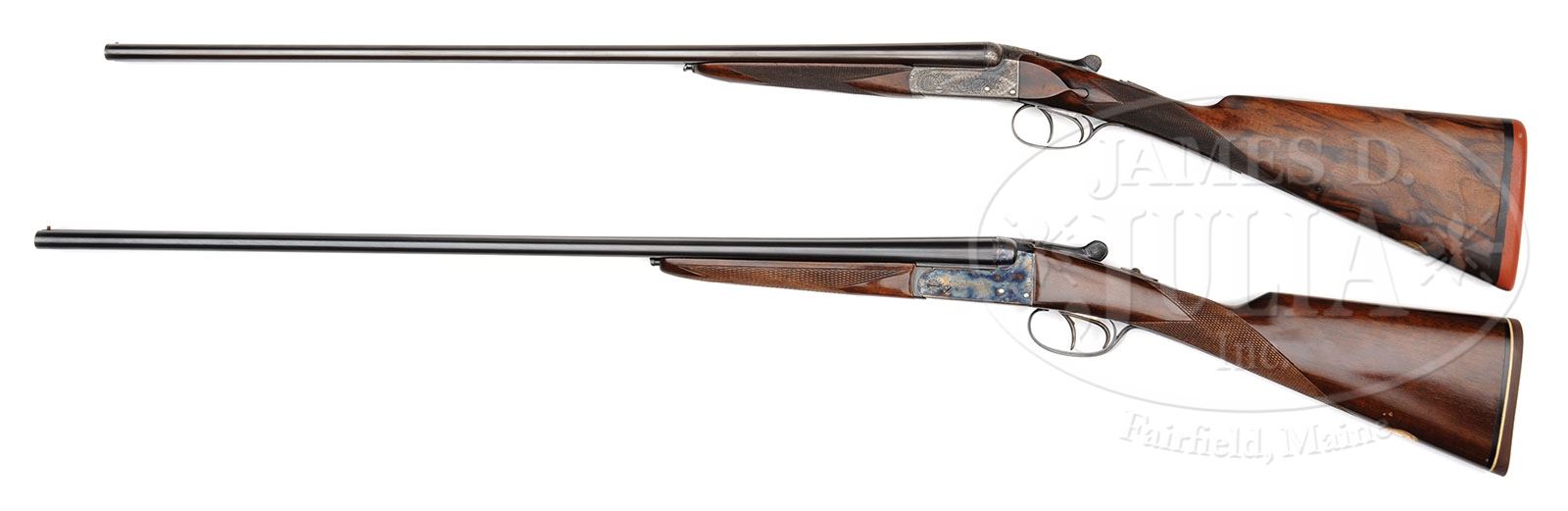 *BRACE OF .410 GAME GUNS, PATSTONE & SON AND AYA BOXLOCKS. SN 1965/ 496358. Patstone (ca 1937) Cal. .410. 2-1/2″ Chambers. 24-3/4″ Dovetailed bbls are engraved “Patstone & Son South Hampton & Winchester. (Silver Metal London 1885 Paris 1878)” on deeply swamped, narrow, game rib. Bbl flats are stamped with 1936 Birmingham nitro proofs for 7/16 oz. of shot, and 2-1/2″ chambers. Tiny, boxlock, case hardened, ejector action features automatic safety and double triggers. Action is engraved with nearly 70% coverage large, open scroll. “Patstone & Son” is on each side. Blued top lever, floorplate, and trigger guard are also scroll engraved. SN is on tang (1965). Nicely marbled, and lightly figured European walnut straight grip buttstock measures 13-1/8″ over old Silver pad, and features drop points, point pattern checkering with mullered borders, and a gold-plated bronze oval on toe line engraved “C L J”. Matching splinter ejector forend has Deeley release. Bore diameter at muzzles: left-.405, right -.405. Wall thickness: left -.030, right -.032. Drop at heel: 2-1/8″, drop at comb: 1-1/2″. Weight: 3 lbs. 14 oz. LOP: 13-1/8″. CONDITION: Fine. Bbls retain approx 80% of what appears to be orig blue. Action retains most of its orig case hardening color. Top lever and floorplate retain nearly all of an old re-blue. Trigger guard re-blued, and a bit on the purple side, silvered at tang. Bores are excellent. Action is tight. Bbls are on face. Ejectors are in time. SN: 496358. Cal. .410. AYA Model 3-A has 27″ chopper lump bbls marked with “AYA” and “Made in Spain” on narrow, concave game rib. Bbl flats are stamped with SN, Spanish nitro proofs, and importers name and address. Case hardened boxlock action features automatic safety, bushed strikers, and double triggers. Action is engraved with simple sinuous border with AYA name on both sides. Plain walnut straight grip buttstock measures 12-1/4″ over thin, white line rifle pad. Point pattern checkering is at grip. There is a gold oval on toe line engraved “C L J”. Matching splinter forend has Anson type release. Bore diameter at muzzles: left-.376, right -.390. Wall thickness: left -.055, right -.060. Drop at heel: 2-1/16″, drop at comb: 1-7/16″. Weight: 5 lbs. 0 oz. LOP: 12-1/4″. CONDITION: Excellent, near new, with only a few handling marks in stock. Mechanically crisp. Two fine little .410s, ideal for a young man or lady. CONDITION: As above. 4-49356 MGM237 (3,000-5,000)