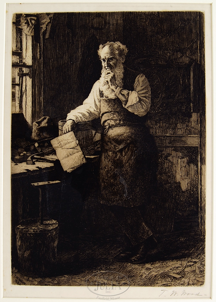 THOMAS WATERMAN WOOD (AMERICAN, 1823-1903) “THINKING IT OVER”. Etching shows a man with white beard in blacksmith’s shop holding Boston newspaper. Signed bottom right in pencil. Signed and dated “1884” in plate. Presently housed in a hinged mat. SIZE: Total: 18″ x 14″. CONDITION: Very good. 9-97370 (600-800)