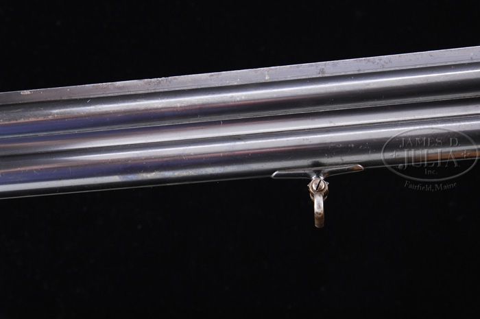 *SCARCE J. P. SAUER MODEL 33 OVER-UNDER EJECTOR GUN WITH EXTRA BARRELS. SN 262569. Cal. 16 Ga. 2-1/2″ Chambers. (Extra bbls with SN 262574 have 2-3/4″ Chambers) 27-1/2″ Demi-block barrels with double Kersten extensions and matted solid ribs, are stamped “Krupp – Laufstahl” on right side of top bbl, and “J.P. Sauer & Sohn, Suhl” on left. Bottom bbl is stamped “Krupp – Laufstahl”, with SN, and eagle over M proof(Second set of bbls does not have this proof.) Rear portion of bbls have Sauer logo and nitro proofs for 2-1/2″ chambers with proof date of 9/40. Second set of bbls has re-proof for 70 mm chambers dated 7/42. Bottom of front lumps have Sauer caveman logo. Deep, rounded, scallop back Blitz action with non-automatic safety and double triggers has about 30% coverage of unusual large open scroll and floral motif engraving. “SSu” Sauer logo is on trigger plate. Plain European walnut pistol grip buttstock measures 14-5/16″ over ribbed composition buttplate with Sauer “SSu” logo, and features typical Germanic right hand cheekpiece, blued steel grip cap, and 20 LPI point pattern checkering with line border. Three piece forend has Deeley release, with SN on iron. Barrel set no. 1 Original: Bore diameter: top -.668, bottom -.667. Bore restrictions: top -.027, bottom -.011. Wall thickness: top -.040, bottom -.041. Drop at heel: 2-7/16″, drop at comb: 1-9/16″. Weight: 7 lbs. 2 oz, LOP 14-5/16″. Barrel set no. 2: Bore diameter: top -.669, bottom -.668. Bore restrictions: top -.025, bottom -.021. Wall thickness: top -.035, bottom -.043. Weight: 7 lbs. 2 oz. CONDITION: Fine. Bbls retain about 80% of their original blue. Extra bbls show considerable light pinprick pitting. Action has traces of original case color in protected areas, but is mostly silver, and slightly frosted to gray. Stocks have most of an old refinish, with numerous marks and nicks. Sling loop on buttstock is missing. Action is tight. Bbls are on face. Ejectors are out of time. Forend is extremely tight with extra set of bbls. Bores are very fine with some slight pitting in top bbl of original set, and toward breech end of top bbl of extra set. 4-39724 MGM108 (3,500-5,000)