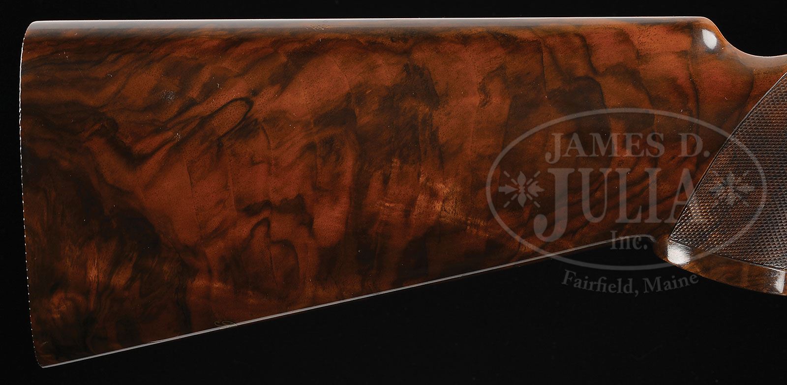 *VERY FINE IVO FABBRI SMALL BORE OVER-UNDER SINGLE TRIGGER GAME GUN ENGRAVED BY CLAUDIO TOMASONI WITH CASE. SN E641. Cal. 20 ga. 2-3/4″ Chambers. Beautifully struck 28-3/8″ demi-bloc bbls fitted with flat, matted, solid rib, are engraved “Ivo Fabbri – Brescia -” and “Vacuum Arc Remelting Steel” on top bbl on either side of rib. Bbl flats are stamped with 1985 Italian nitro proofs for 20 ga. Unusual, case hardened, low profile, over under action features noon-automatic safety (SAFE engraved), single non-selective trigger, and grooved tumbler end cocking indicators. Action and lockplates are fully engraved with cleanly cut, sculpted, and shaded, semi-relief, large, open scrolled acanthus with floral highlights. “IVO FABBRI” and “BRESCIA” are on ribbons across bottom of action. This fine work is by noted engraver, Claudio Tomasoni, whose signature appears on trigger plate. Wonderfully marbled, stump figured European walnut full pistol grip buttstock measures 14-1/16″ over checkered wood butt. Well cut borderless point pattern checkering is at grip, and individual gold script initials “R G B” are inlet on toe line. Matching, slim, one piece forend has Anson type release with typical Fabbri wraparound steel tip. Bore diameter: top -.620, bottom -.620. Bore restrictions: top -.024 (Full), bottom -.017 (Mod). Wall thickness: top-.024, bottom -.028. Drop at heel: 1-7/8″, drop at comb: 1-5/16″. Weight: 6 lbs. 2 oz. LOP: 14-1/16″. Americase Premium aluminum case has double latch and combination lock. It is lined with black velvet and contains instructions for changing combination and a key. CONDITION: Excellent, near new, with only one or two of the faintest marks on metal and a hint of silvering on sharp edges of action beads. Breech face shows very faint halos from cartridge heads. A few scattered marks are on buttstock around grip. Checkering is slightly darkened. Mechanically crisp. Case is very fine with some scratches on exterior. Interior is excellent. Fabbri is well known for making some of the finest shotguns ever produced. New guns start at 100,000 euros without engraving. 4-48840 MGM60 (65,000-95,000)
