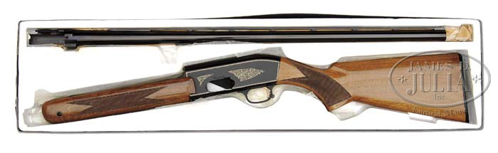 *BROWNING TWELVETTE DOUBLE AUTOMATIC WITH BOX. SN 71A55264. Cal. 12ga. 27-1/2″ vent ribbed bbl with single silver sighting bead, full choke, 2-3/4″ chamber. Left side bbl “BROWNING ARMS COMPANY, MORGAN, UTAH & MONTREAL, P.Q./MADE IN BELGIUM”, right side “*SPECIAL STEEL – 12GAUGE – SHELLS 2-3/4″/BROWNING PATENTS”. The black anodized receiver has zig-zag border with gold fill and foliate scroll with gold fill on left side marked “TWELVETTE” over left side feeding port. Right side has foliate scroll and zig-zag border with gold fill. Standard stock and forend with hard rubber buttplate “BROWNING DOUBLE AUTOMATIC” with bust of John M. Browning. Accompanied with original box. PROVENANCE: Private Coll. of a Gentleman. CONDITION: Extremely fine, appears new and test fired only. Retains all of its original factory finish. Box is in good condition with a torn corner and some minor scuffing. 4-41918 BDT213 (1,250-1,750)