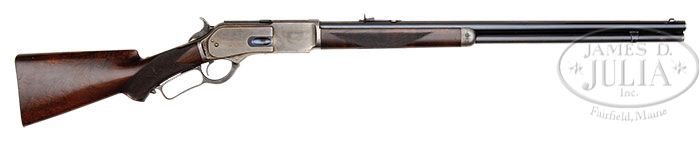 RARE SPECIAL ORDER DELUXE ENGRAVED WINCHESTER MODEL 1876 “BIG 50” LEVER ACTION RIFLE. SN 23296. Cal. 50-95 Express. Beautiful deluxe rifle with 26″ rnd bbl, full magazine, half nickel front sight and short semi-buckhorn rear sight with checkered edges. Bbl is full matted with caliber marking “50” on right side of matted panel and “CAL.” on left side. Receiver is 2nd Model with screwed-on dust cover rail and dust cover marked “WINCHESTER EXPRESS / 50 CAL 95 GRS.” Sides of hammer, lever & forend cap are very nicely engraved in about $2.50 coverage. Engraving consists of fine foliate arabesque patterns with line borders on lever & hammer. Mounted with 2-3X center crotch flame grain American walnut with H-style checkered forearm and serpentine pistol grip buttstock with fleur-de-lis horn inlay and a smooth steel shotgun buttplate. Left side of lower tang, under the wood, is marked with assembly number “313”, “XX” and “S”. Matching assembly number is found in top tang channel of buttstock with buttplate having the assembly number “332” inside the toe. Receiver, lever, hammer & forend cap are color case hardened. Accompanied by a Cody Firearms Museum letter which identifies this rifle in caliber “Express” with 26″ rnd bbl, “matted barrel, etc.”, plain trigger, checkered stock with pistol grip, shotgun butt and case hardened, received in warehouse June 30, 1882 and shipped next day to Order #32468. Although the engraving is not specifically mentioned in the letter, it is probably covered by the “Etc.” which follows “matted barrel”. Also accompanied by a small tin document box containing 48 reloaded cartridges, 20 of which are in a partial orig green label box and 21 empty brass casings. A complete 3-die set of RCBS loading dies and an Ideal bullet mold with handles. CONDITION: Very fine. Bbl & magazine tube retain 95-96% strong orig blue with a few light spots on bbl and the outer radius of the magazine tube a little thin and turning plummy; receiver & sideplates retain about all of their orig case colors, brilliant in front of trigger and lower tang, bright in other sheltered areas but generally faded; dust cover retains most of its high polish blue; hammer retains bright case colors and the lever bright case colors on sides, faded on outer faces; forend cap retains about all of its faded case colors. Wood is sound with light handling & storage nicks & scratches and retains most of its orig piano varnish on the buttstock with about 50% on forearm showing wear at back half and on checkering. Mechanics are crisp, bright shiny bore. Reloaded ammunition is fine; empty casings are corroded; dies & mold are fine. 4-45672 JR280 (25,000-40,000)