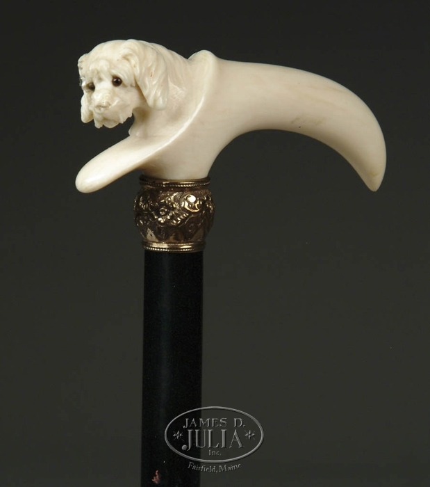 CARVED IVORY DOG CANE. Terrier type dog peaks out from a smooth curved carved handle. Dogs head angles to one side and has well carved fur and glass eyes. 3/4” embossed gold plated collar with flower decoration is mounted on an ebonized wood shaft having a 1-1/4” tapered horn ferrule. SIZE: 35” l. Handle is 1-1/2” h x 4-3/4” l. CONDITION: Very good. 9-28215 (800-1000)