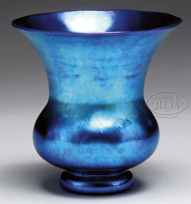 STEUBEN BLUE AURENE VASE. Blue aurene shade pedestal vase. Signed “Steuben” to underside of foot. SIZE: 5″ dia. 5″ t. PROVENANCE: From the Private Collection of Dorothy Lee Jones. CONDITION: Very good to excellent with minor scratches to finish. 5-61809 (400-600)