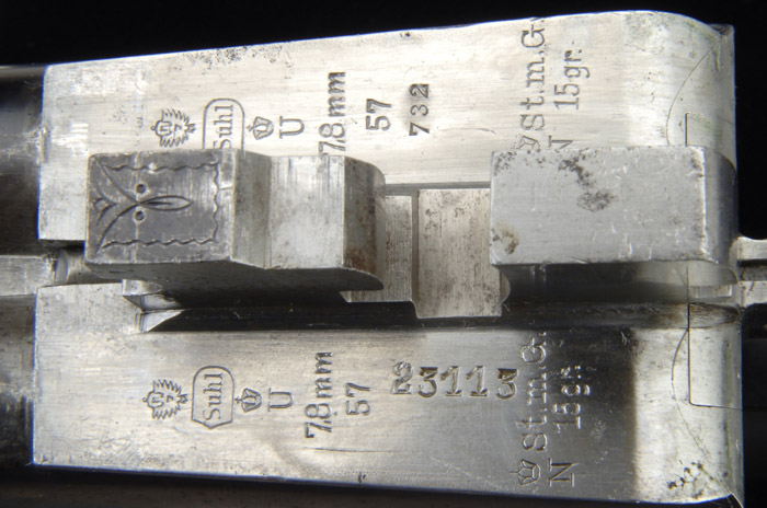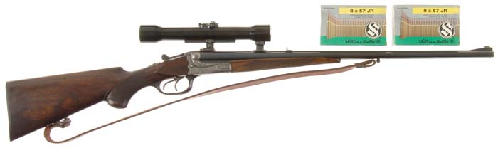 *UNMARKED DOUBLE RIFLE. Cal. 8X57JR. SN 23113. This fine quality double rifle has 23-1/2” bbls with flat, matted rib, ramp front sight, 2-leaf rear sight with claw mount bases containing a Zeiss Zielvier scope of about 4X with crosshair post & dot. Mounted with very nicely figured French walnut with fine checkered, horn tip, splinter forearm and pistol grip stock with raised side panels & cheekpiece, 14” over a serrated horn buttplate. It also has a horn triggerguard & fluted horn grip cap. Receiver has side clips with side reinforcements, cocked indicators and is lightly engraved with arabesque patterns. The dbl triggers are both set. The bbl has a screwed on safari sling swivel with a corresponding swivel in butt containing a narrow European style leather sling. Accompanied by eleven boxes of Sellier & Bellot 8X57JR ammunition with 196 grain soft point bullets, appear to be all full & orig. Drop at heel: 2-3/8”, drop at comb: 1-5/16”. Weight with scope: 7 lbs. 11.52 oz. CONDITION: Fine. Bbls retain about 90-92% strong orig blue with a few spots of light rust. Receiver retains 15-20% case colors in very sheltered areas with balance turned silver. Forearm has a few chips from bbl channel on each side with a repaired splinter and the stock has a couple of hairlines back of receiver, otherwise wood is sound with normal handling & use marks showing moderate to heavy wear and overall retains most of an old wiped on finish. Mechanics are fine, bright shiny bores, optics are crisp and ammunition is clean & bright. 4-60288 JR38 (6,000-10,000)