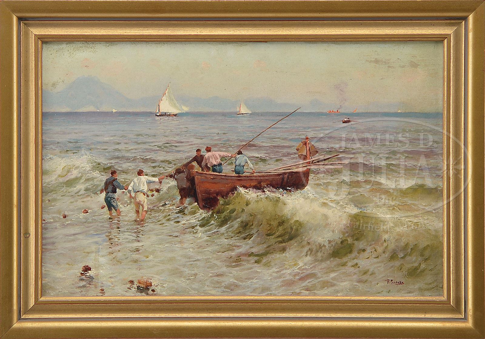 ATTILIO PRATELLA (Italian, 1856-1949) MEN WITH FISHING BOAT ON BEACH. Oil on board Housed in a gilt molded wood frame Signed “A. Pratella”, lower right SIZE: 10″ x 15-1/2″. Overall: 12-1/2″ x 18-1/4″ PROVENANCE: A fine downeast Maine home CONDITION: Surface dirt, very good 9-28810 (5,000-10,000)