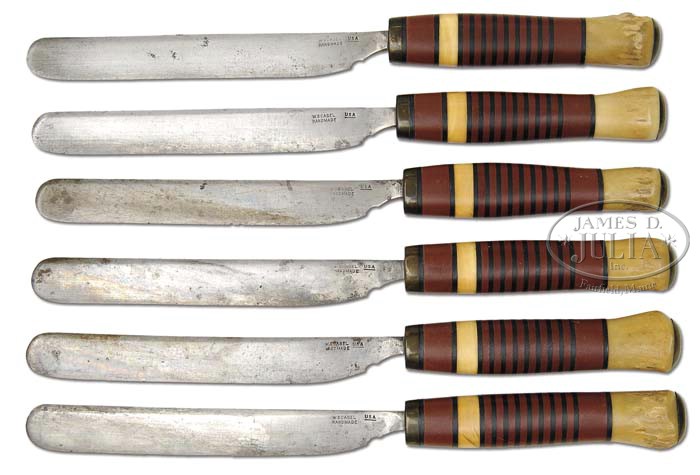 EXTREMELY RARE SET OF 6 SILVER MOUNTED MATCHING TABLE OR BUTTER KNIVES. This set is currently only 1 of 2 sets I know of and is the earliest documented set of Scagel knives known to me. The knives are 8-3/4″ overall, with a blade length of 5″. This set was made in 1913 as a wedding present for the marriage of Carmen Sylvia Gillette and Charles Hackley Lee, prominent and wealthy families in Muskegon, Michigan in 1914. The history, photos, documents, and marriage license will be given to the buyer of this set. The stacked handles are composed of ivory and stag, and red and black fiber spacers with pure silver ferrules and end caps. The blades are stamped with the name stamp and “USA.” The set is housed in an original maroon felt roll wrap with jeweler’s instructions regarding the care of the knives. PROVENANCE: Dr. Jim Lucie Collection. CONDITION: The handles are mint. The blades have tarnish and staining but are in excellent overall condition showing no evidence of ever having been sharpened. 4-45594 JL71 (18,000-24,000)