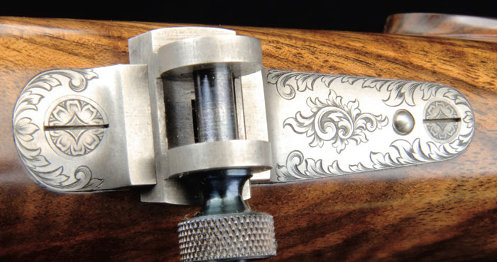 *RARE LYNTON-McKENZIE ENGRAVED JOHN MADOLE CUSTOM BUILT MODEL 1877 SHARPS RIFLE. Cal. 45-100. SN 1. Spectacular rifle, completely built by hand, by master gun maker, John Madole of Jamestown, KY, and signed on top of bbl. It has a 33-7/8” rnd bbl with Rigby flat at breech end. It has a custom windgage globe front sight, no provision for a rear bbl sight and has a long range vernier tang sight with 6-1/4” staff. Mounted with extremely fine, highly figured, streaky French walnut with rnd checkered forearm, ebony tip & pistol grip stock with black insert serpentine bottom & shadow cheekpiece, 13-3/4” over an engraved, smooth steel buttplate. There is a custom built Creedmore base inletted into top of stock at heel. Receiver is very beautifully engraved in foliate arabesque patterns with a pointed arch border around front edge, a flower blossom on left side of lever pin screw & beautiful details on screw heads. Rigby bbl flat, top tang, lever, bottom tang, both sight bases & buttplate are all engraved to match and finished in bright metal. Breech block is case hardened. Trigger is very nicely finished with an ornate hook on back edge. Serial number is engraved on bottom left edge of receiver. Frank Sellers, noted Sharps authority, stated that this rifle is nearly perfect except that lever hinge pin radius extends a little too far below receiver & forearm is not quite right shape. He stated that he is very impressed with workmanship. It should be noted that the checkering & wood to metal fit is of the highest quality. Accompanied by a fabulous Huey oak & leather case, #459, with gray chamois lining, French fitted for rifle, three turn screws with engraved, gold plated ferrules, a wood handle cleaning rod with engraved, gold plated ferrule, an engraved, gold plated, metal patchbox with turned, decorative walnut top & engraved, gold plated knob. It also has a gold plated, rnd oil bottle with engraved top & knob and has six covered compartments with engraved, gold plated knobs. One of compartments contains a spirit level clip for front sight. Another compartment contains six dummy 45-100 cartridges. Inside lid is a custom black leather label embossed in gold, “JOHN MADOLE / GUNMAKER / JAMESTOWN KY / JAMES CORPE – STOCKER / LINTON McKENZIE – ENGRAVER / STEPHEN ALEXANDER – ACCESSORIES”. CONDITION: Exceedingly fine, unfired. Retains all of its fantastic custom finish to both metal & wood. There are no discernible flaws beyond one or two tiny marks in stock finish. Mechanics are crisp, brilliant shiny bore. Case & cover are equally new. 4-58950 JR340 (25,000-35,000)