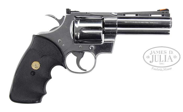 *COLT STAINLESS STEEL PYTHON DA REVOLVER. SN T64087. Cal. 357 Mag. Fine double action revolver with 4″ vent rib bbl, red ramp & white outline adjustable sights with gold Colt medallion Pachmayr grips. CONDITION: Extremely fine. Overall retains most of its strong orig bright polish showing only light use. 4-37863 JR198 (750-1,250)