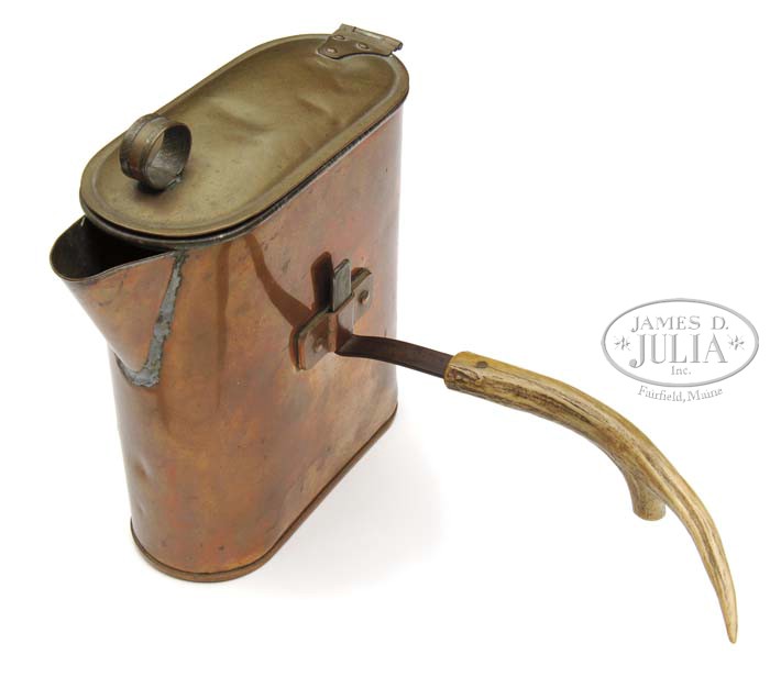 SCAGEL MADE COFFEE POT. A wonderful example of Scagel’s artistic ability to create beautiful and functional copperware. 9″ high, 8″ wide and 3″ in thickness, with very clever removable iron-and-stag holding handle. This was made for Emil Persuk in 1932 and is pictured on page 178 of Scagel Handmade by James R. Lucie. PROVENANCE: Dr. Jim Lucie Collection. CONDITION: Very fine condition with a few minor dents. Has 2 Scagel Kris stamps on the well-soldered seam. 4-46219 JL3 (1,000-1,500)