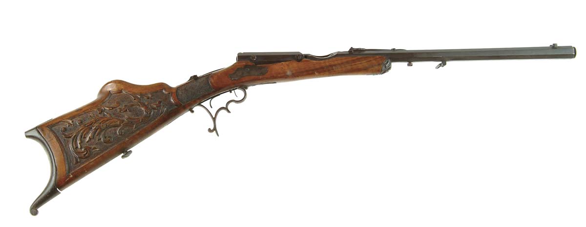 FINE GERMAN TARGET RIFLE. Cal. Unknown. A type of Zimmerschutzen rifle with 18-3/4” swamped medium weight oct bbl, fine original bbl sights, with a large front bore but no provision for a cartridge of that size at the rear. It is bolt action with the bolt handle missing. It is mounted in a 1-pc schutzen stock with iron furniture, a schutzen trigger guard with wide spaced double set triggers and elaborately carved and checkered buttstock. It has a swivel stud in the stock and a schutzen style buttplate. The top tang has a square base for a tang sight. All in all, a very unusual little rifle that is possibly missing some other bolt parts. CONDITION: Metal retains a very dark even patina overall. Stock is missing a sliver on the right side by the receiver and has another chip that is loose, otherwise is sound with a dark dirty patina. Double set triggers do not function. 4-50493 JR810 (400-700)