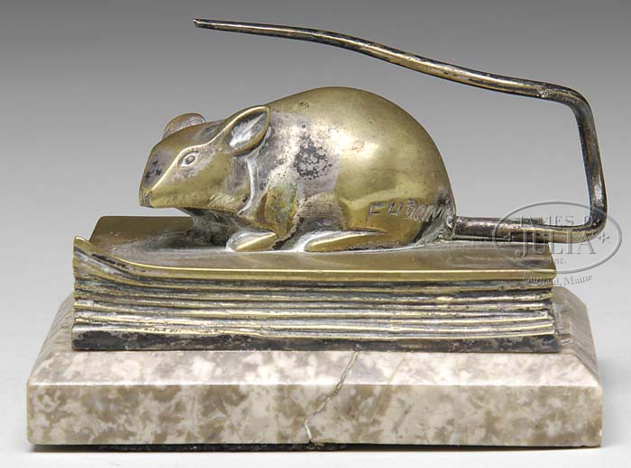 F.H. DANVING (19th/20th Century) BOOK MOUSE. Small bronze of a mouse atop a book mounted on a beveled edge rectangular piece of granite. The mouse signed on its body and the piece at one time was silvered. SIZE: Overall: 2-1/4″ h x 3-1/2″ w x 2-3/4″ d. CONDITION: 80% loss of silver, otherwise very good. 9-23787 (200-300)