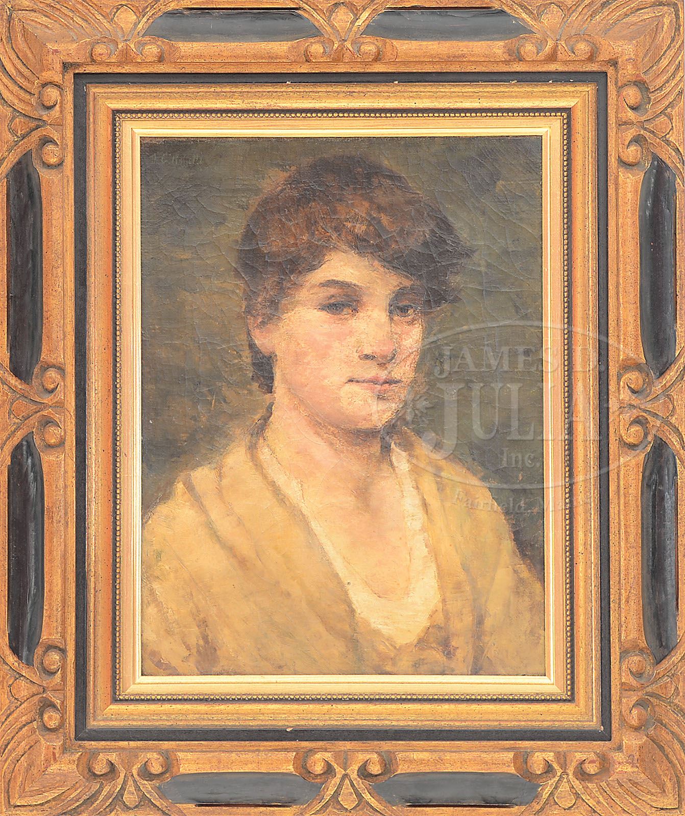 ATTRIBUTED TO DANTE GABRIEL ROSSETTI (British, 1828-1882) “JENNE DE FRANCE”. Oil on canvas Housed in a decorative partial gilt and painted carved frame with gilt liner Signed upper left “D.G. Rossetti, having a partial label on reverse with title and artist SIZE: Sight: 16″ x 12″. Overall: 24″ x 20”. CONDITION: Wax lining, craquelure in painting. 9-29474 (1,000-2,000)