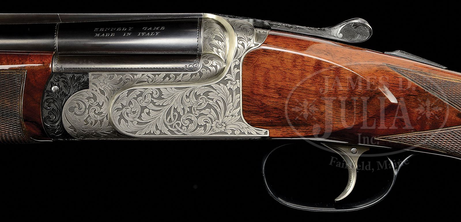 *MATCHED PAIR OF PERUGINI & VISINI “KENNEDY GAME” TWENTY GAUGE GAME GUNS. SN 2992/ 2993. Cal. 20 ga. This fine pair of guns, similar to the Maestro Series of P & V guns, with detachable trigger/ firing groups, have 30″ mono-bloc bbls fitted with narrow, matted, ventilated ribs, which are marked “KENNEDY GAME” “MADE IN ITALY” (Tony Kennedy, is a well known British dealer specializing in bespoke Italian guns) on top left of mono-bloc. Bottoms of mono-blocs are stamped with 2004 Italian nitro proofs and “P – V” logos. Coin finished low profile OU actions with removable trigger groups feature non-automatic safeties and selective single triggers, and are engraved with exceptionally well sculpted, semi relief, large, flowing acanthus scroll with some floral highlights, and fine stippled background. (No engravers signature noted.) Top levers and trigger guard bows are blued. Nicely marbled European walnut full flared pistol grip buttstocks measure 15-3/8″ over checkered wood butts. Point pattern checkering is at grips. Stocks are finished in high gloss. Matching one piece forends are 90% checkered and have Anson type releases. Gun no. 2992: Bore diameter: top -.620, bottom -.620. Bore restrictions: top -.015 (Mod), bottom -.015 (Mod). Wall thickness: top-.040, bottom -.040. drop at heel: 2-1/8″, drop at comb: 1-1/8″. Weight: 6 lbs. 12 oz. LOP: 15-3/8″. Gun no. 2993: Bore diameter: top -.619, bottom -.621. Bore restrictions: top -.015, bottom -.016. Wall thickness: top-.040, bottom -.039. Drop at heel: 2-1/8″, drop at comb: 1-1/4″. Weight: 6 lbs. 14 oz. LOP: 15-3/8″. Italian ABS two gun case with three combination locks. Interior is lined in ruby velvet and contains socks for bbls and actions. CONDITION: Excellent, essentially as new, showing little evidence of having been fired, with only some marks on mono-bloc from assembly and disassembly. There are some miniscule minor handling marks on bbls and in stock finish, with some slight crazing of stock finish on gun no. 2993. Mechanically crisp. Case is excellent. 4-47798 MGM21 (17,500-27,500)
