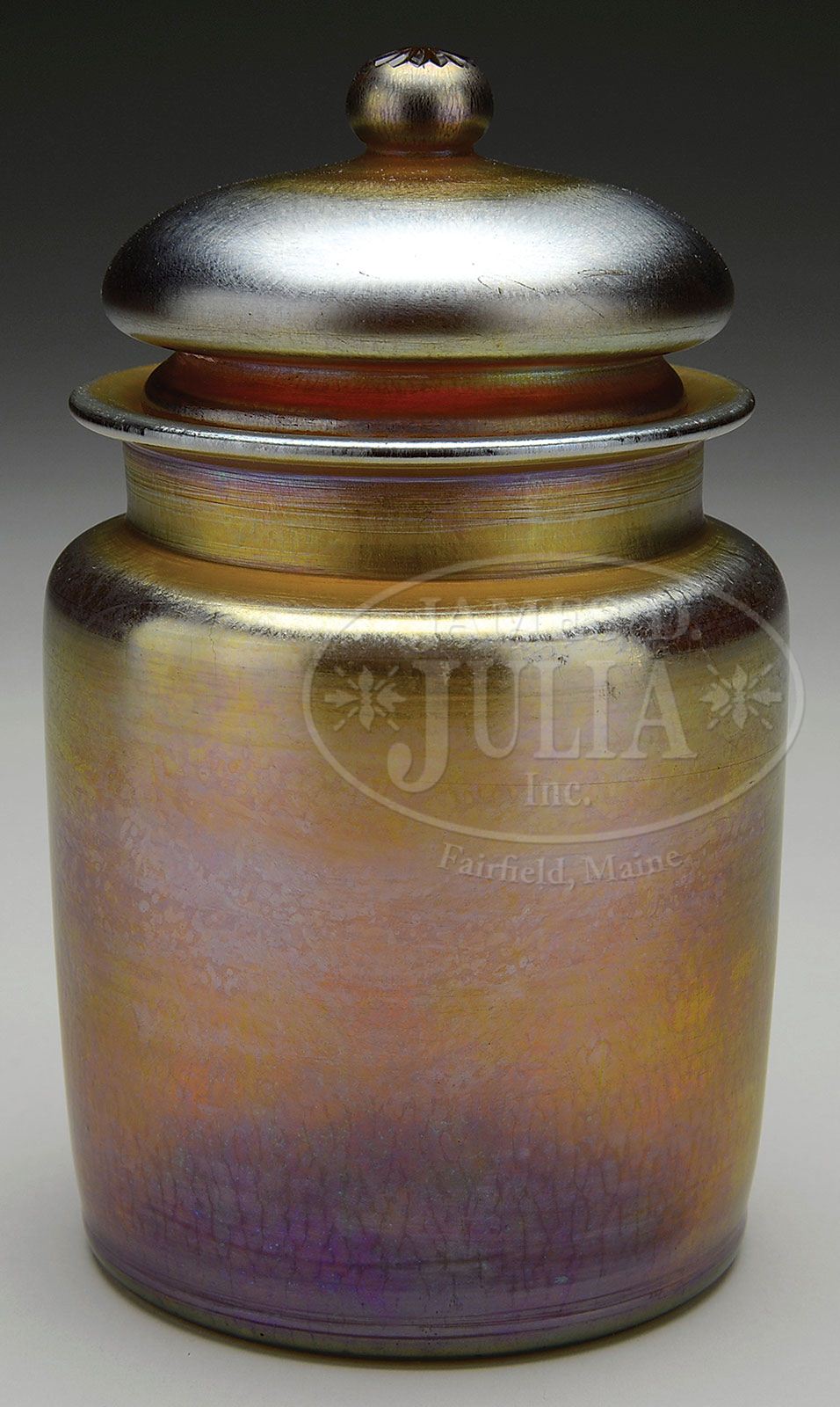 TIFFANY GOLD FAVRILE COVERED JAR. Nice Tiffany covered jar is done in a bright gold iridescence with pink and platinum highlights. The jar’s lid has a starburst decoration carved on the top of the finial. Jar is signed in the polished pontil “LC TIFFANY INC FAVRILE 3352N”. SIZE: 7-1/2″ t. CONDITION: Very good to excellent with a few tiny scratches to iridescence. 5-65628 (2,000-3,000)
