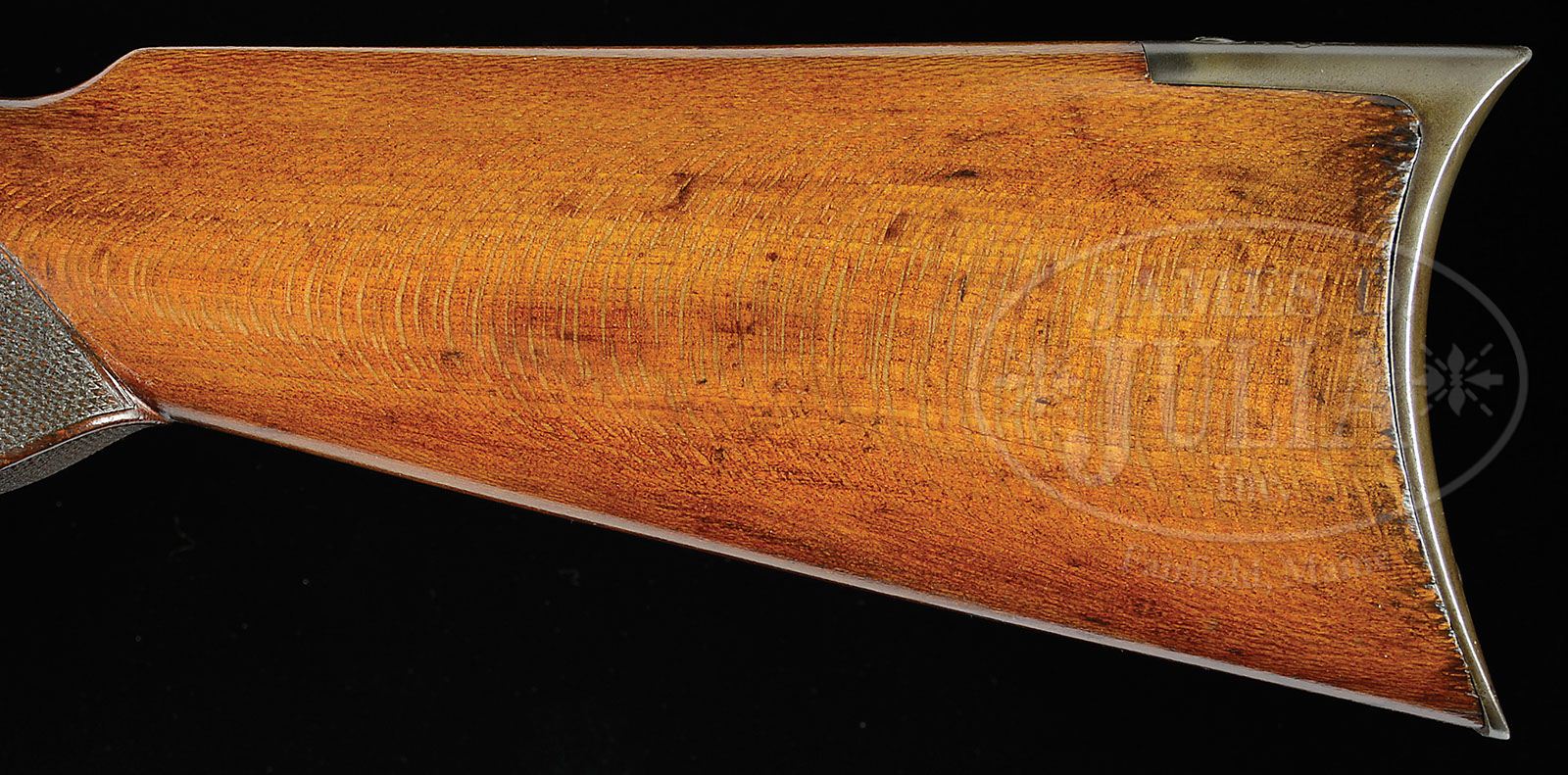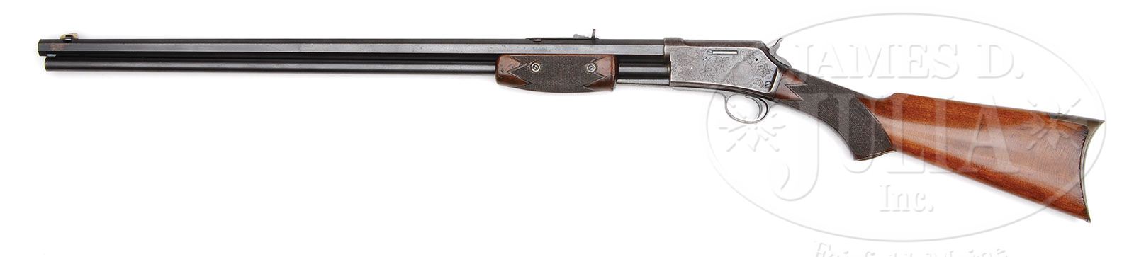 VERY RARE SPECIAL ORDER FACTORY ENGRAVED COLT MEDIUM FRAME LIGHTNING SLIDE ACTION RIFLE. SN 80940. Cal. 32 CLMR (32 WCF, 32-20). Beautiful special order deluxe rifle with 26″ oct bbl, blue finish, with full pistol grip sycamore stock, factory engraved and shipped to A.G. Spalding & Brothers, Chicago, Il. on April 30, 1897 in a one gun shipment. Rifle is second type with patent marked bbl address. Receiver is beautifully engraved in grape leaf, vine and clusters of grapes pattern with the Rampant Colt logo on left side and a squirrel sitting on a grape vine eating grapes on right side. Engraving extends over top of receiver, dust cover, trigger bow and trigger plate with snake patterns down the bottom edges and around the bottom tang. Tip of bottom tang is engraved with a grape leaf with another at tip of top tang. Top tang and rear edge of receiver have a double line border which also surround the hammer slot. Bolt opening is surrounded by an engraved rosette. Side front edges of receiver are engraved in a half flower blossom. Buttplate tang is engraved with a matching grape leaf. This work appears to be by master engraver Conrad Ulrich. Mounted with most unusual and rare, very highly figured sycamore wood consisting of a 2-pc checkered, single schnable forearm and pistol grip stock with crescent buttplate. Bottom of grip is a checkered oval. Left side of upper tang is marked with matching SN along with a tiny “6.” and identical “6”. is also on lower tang. Matching SN is also found on the front edge of the buttstock, under the metal, and inside the toe of buttplate. Buttplate additionally has an old SN which appears to have been an assembler’s mistake that was corrected. According to Flayderman’s Guide to Antique American Firearms there were about 89,777 medium frame rifles produced in the period 1884-1902 in several different styles. Very few of these were deluxe and most rarely were any of those engraved. The special order wood adds an additional rare dimension almost never encountered. Consignor states only 19 medium frame Lightnings were shipped to A.G. Spaulding. PROVENANCE: Colt Factory Letter. CONDITION: Fine. Bbl and mag tube retain 95-96% strong orig blue turning a little plummy over the chamber area of bbl and with a few scattered spots of fine rust. Receiver retains about 50% blue turning plum, stronger in sheltered areas. Wood is sound with a few chips on edge of forearm and a few other scattered light nicks and scratches and overall retains about all of an old restored finish. Mechanics are crisp, strong bore with good shine, frosty and dark in grooves. 4-47341 JR158 (17,500-27,500)