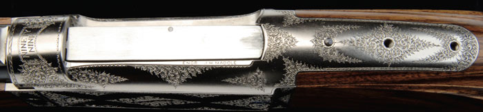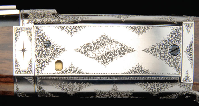 *CUSTOM BY JOHN MADOLE SAVAGE MODEL 99 LEVER ACTION RIFLE. Cal. 303 Savage. SN 339721. Spectacular custom Savage with metal work by John Madole, custom gunmaker of Jamestown, KY, & stocked by James Corpe. This was Mr. Corpe’s sample work for admission to the American Custom Gunmaker’s Guild in 1989, which immediately granted him membership. All metal work & engraving is by the hand of John Madole. Trigger & safety are both custom designed & made by Mr. Madole. Rifle is a standard takedown Model 99 with 22” tapered rnd bbl with custom pedestal front sight base mounted with a custom German silver blade Rocky Mountain sight. It has a 3-leaf, custom made, gold line express sight mounted on a custom quarter rib. Mounted with extremely beautiful, highly figured, streaky, marble cake, honey & chocolate, French or Circassian walnut with dainty, tapered forearm with ebony insert, schnable tip & flared, raised side panels with a custom single wedge through escutcheons mounted in raised panels. Buttstock has flared raised side panels with a flat European cheekpiece, straight comb, capped pistol grip & an engraved smooth steel buttplate. There is a silver initial plate on bottom, secured with six pins. While there is no front sling swivel base, there is a custom mortised rear swivel base set in a fluted pedestal. Receiver & all appended metal parts are nickel finished & beautifully engraved by John Madole with extremely tasteful coverage in foliate arabesque patterns with delicate scallop & arrowhead borders. Both sides of takedown ring have the hunter’s star. Left side has “SAVAGE” in a ribbon & top left edge of ejection port has “ENGR. J.H. MADOLE”. Center of buttplate is engraved in two ribbons “STOCKMAKER / J. CORPE”. It should be noted that the checkering & wood to metal fit are of extreme highest quality. Accompanied by a beautiful Huey, green ultra-suede lined, oak & leather case, French fitted for rifle, three turn screws, a brush & brass 3-pc cleaning rod, all with ebony handles. It also has a brass oil bottle & parts can. Inside lid is a custom leather label gold embossed “SAVAGE ARMS CO. / MODEL 99 / .303 SAVAGE / JOHN MADOLE ENGRAVER / JAMES CORPE STOCKMAKER”. CONDITION: Extremely fine, appears to be unfired since finish. Retains virtually all of its beautiful custom finish to both metal & wood. Mechanics are crisp, bright shiny bore. 4-58939 JR345 (5,000-10,000)
