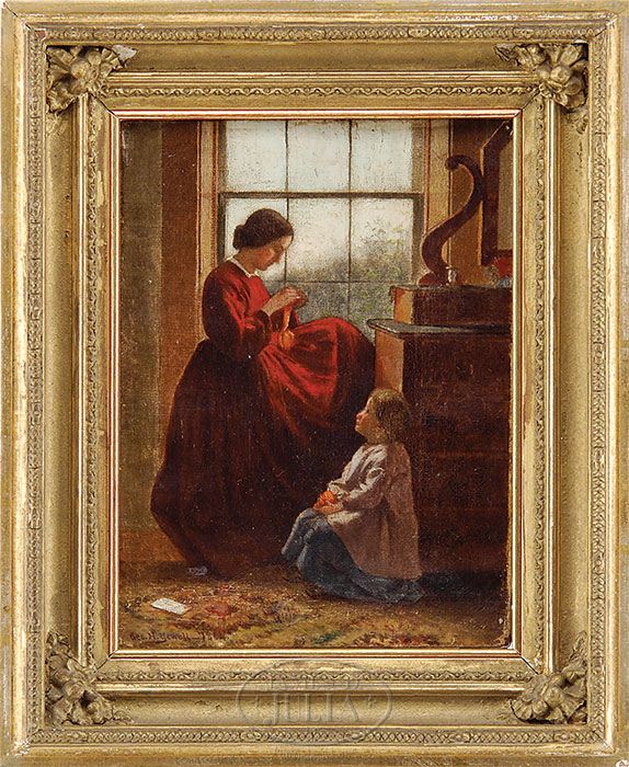 GEORGE HENRY YEWELL (American 1830-1923) THE LITTLE HELPER. Oil on canvas interior scene shows a woman seated beside a window knitting while a young girl sits beside Empire bureau holding a red ball of yarn. Signed lower left and dated “1864”. Housed in a period frame with an O.J. Marvin Medford, Mass label. SIZE: 8″ x 6″. CONDITION: Very good. 9-27069 (1,400-1,800)