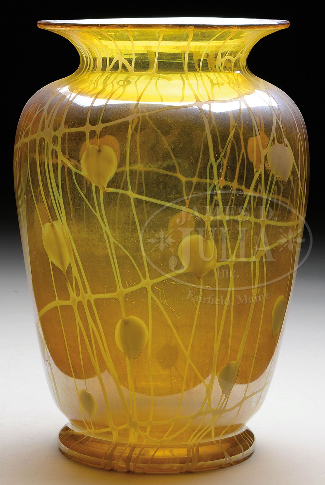 DURAND HEART & VINE VASE. Large Durand vase has white heart and vine decoration against a transparent yellow background with light gold iridescence. Unsigned. The vase is pictured in the book Durand: The Man & His Glass by Edward J. Meschi, pg. 83, illus. 290. SIZE: 12-1/4″ t. CONDITION: Very good with some minor scratches to the side. 5-66892 (600-1,000)