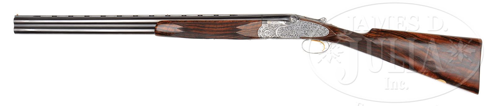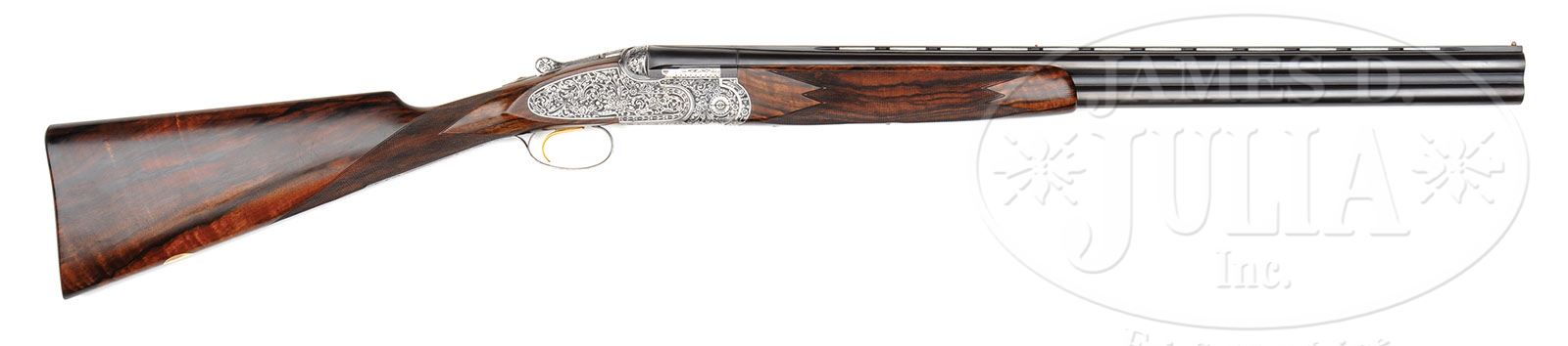 *FABULOUS FIRMO FRACASSI ENGRAVED BERETTA S3EL WITH CASE. SN 28827. Cal. 12 ga. 26″ Mono-bloc bbls with matted, ventilated rib are marked “BOHLER * ANTINIT STEEL” “P. BERETTA – Gardone V.T.” and “MADE IN ITALY” on left side of top bbl. Bottom of mono-bloc is stamped with 1965 Italian nitro proofs. Coin finished. low profile, sidelock O/U action features thumbnail hand-detachable locks, non-automatic safety, gold-plated non-selective single trigger, and gas escape vents on breechface. Action and lockplates are engraved with very well cut and shaded, “Renaissance” style, semi-relief, large, open scrolled acanthus with floral highlights. Engravers signature “Fracassi F.” is on trigger plate. Bottom of action is engraved “P. BERETTA GARDONE V.T.” and “BREVETTEATO ITALY”. Very fine, well marbled, and lightly figured European walnut straight grip buttstock features well cut point pattern checkering with line borders, a vacant gold oval on toe line, and measures 14-5/8″ over checkered wood butt. Slim, one piece matching forend has Deeley type release. Bore diameter: top -.721, bottom -.721. Bore restrictions: top -.014 (Lt. Mod), bottom -.003 (IC). Wall thickness: top-.032, bottom -.030. Drop at heel: 2-3/8″, drop at comb: 1-3/8″. Weight: 6 lbs. 14 oz. LOP: 14-5/8″. High quality Nizzoli dark russet leather case with stitched leather corners and brass combination lock, is lined in dark green cloth, and has black leather gold embossed Beretta label in lid. CONDITION: Excellent, as completely refurbished, retaining essentially all custom finishes to metal. Newly made stocks show only a few light handling marks in their excellent rubbed oil finish. Bores are excellent, bright and shiny throughout. Action is tight. Ejectors are in time. Trigger works. Case is excellent with a few light scuffs and scratches on exterior. Interior is essentially as new. A finely finished classic O/U. This level of engraving by Firmo Fracassi, would cost approx $50,000.00 today. 4-49116 MGM310 (7,500-12,500)