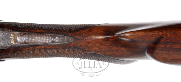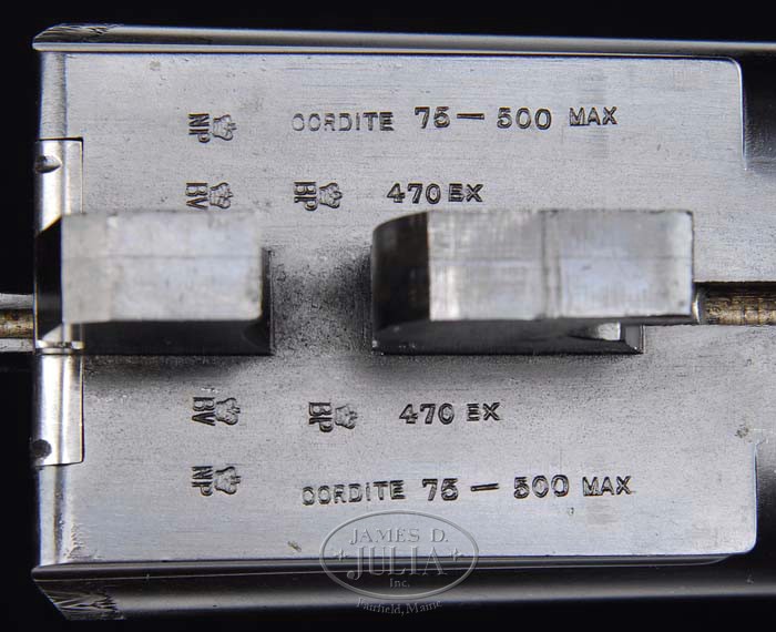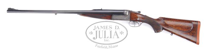 Correction: The term “long top tang” can be interpreted as an extended top tang, or strap, which extends over the nose of the stock comb. This gun does not have an extended top strap but rather a standard length tang. *GALLYON & SONS BOX LOCK DOUBLE RIFLE WITH CASE. SN 10644. Cal. .470 Nitro express. 26″ Chopper lump steel bbls have one standing and 3 folding express sights mounted on matted quarter rib w/ dove-tail extension, matted mid rib, and stippled ramp front sight w/ silver bead and folding night bead. Top of right bbl engraved “Gallyon & Sons” and on the left “66 Bridge Street Cambridge.” Action flats are stamped with Birmingham nitro proofs for “cordite 75 – 500 max.” “470EX” Bottoms of the bbls are marked “Gussstahl Krupp Essen” and are engraved “470EX cordite 75 grs bullet 500 grs.” The loop is stamped with number “36940”. Bbls have a sling eye mounted on bottom rib. The robust, case hardened, box lock action features double under lugs, a bolted dove-tail dolls head, side clips, and bushed strikers, and is engraved w/ typical scroll engraving, a pair of prowling tigers on the left side, a pair of elephants walking through woodlands on the right, and a broad side standing lion is on the floor plate. “Gallyon & Sons” is engraved on both sides. The trigger guard is engraved w/ a crouched leopard on the bow, and SN “10644” (1905 per factory letter) on the grip. The long top tang has “safe” inlaid in gold in front of the non automatic safety button. The slightly figured English walnut full pistol grip buttstock measures 14-1/2″ over a red Silvers type pad and features drop points and vacant silver oval, sling eye, 18 LPI checkering w/ mullered borders, and shadow line cheek piece for right handed shooter. The pistol grip ends in an engraved steel cap w/ trap containing 3 spare strikers, and a spare front sight. Numbers “14” and “1100” are stamped on the toe line behind the sling eye. The Anson release splinter forend has wood and checkering to match buttstock. Drop at comb: 1-3/4″. Drop at heel: 2-5/8″. Weight: 11 lbs 13.7oz. Newly made oak and leather case w/ brass corners and central oval medallion on lid. Interior in green cloth, and is French fitted for accessories, which include 2 oil bottles (1 round, 1 square), 3 coco bolo handled turn screws, a pair of snap caps and a key. PROVENANCE: Copy of letter from the maker, dated 27 Aug 1991, stating that rifle was made in 1905 for a Captain Rimmington. CONDITION: Fine. Bbls retain virtually all of a professional re-black. Bores are very fine, w/ very little evidence of use. Action retains 30-40% orig case color mostly turning to silver w/ brown on the edges. Floor plate retains 50% orig charcoal blue. Trigger guard retains 40% orig blue. Top lever 80%. Screw slots show very little use. Stocks retain most of their hand rubbed oil finish. Checkering is slightly dirty, and shows some wear. Bbls feel very slightly loose with forend off, but appear to be still on face. No movement is felt w/ forend installed. Case and accessories are as new. A wonderful heavy rifle! 4-35112 MGM29 (22,500-27,500)