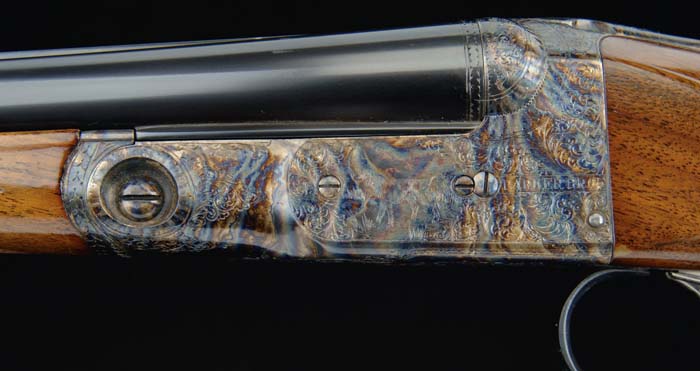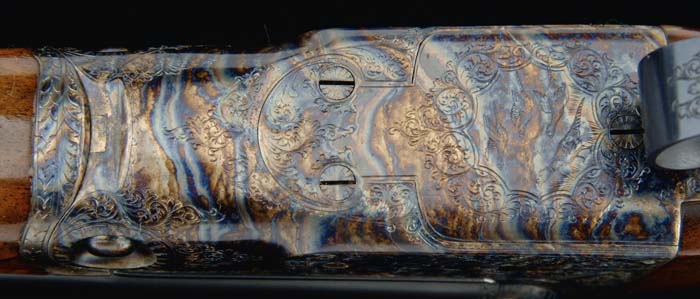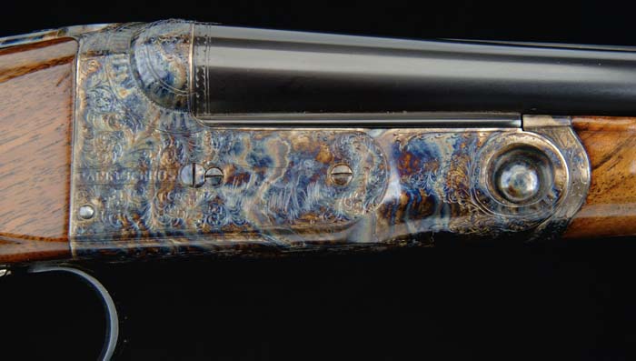 *PARKER DH GRADE DOUBLE BARREL SHOTGUN. Cal. 28 ga. SN 191344. Built on a “OO” frame with 25-1/2” Titanic Steel bbls choked CYL/CYL and appear to be orig length. It has tapered, concave, matted rib with dbl ivory beads, doll’s head rib extension, extractor & dbl triggers. Mounted with replacement, center feather crotch cut, American walnut with checkered, splinter forearm & straight stock with raised, teardrop side panels, 14-1/2” over a checkered, skeleton buttplate. Bottom tang channel is stamped with serial number and “LDG” with date “12.8.80”. Presumably this stands for Larry DelGrego, having restocked this shotgun in 1980. Receiver is engraved in typical “D” patterns with a setter on left side, a pointer on right side & four pheasants on floorplate, surrounded by foliate arabesque patterns and maker’s name on each side. Water table has lightning cuts. Bore diameter: left – .554, right – .553. Bore restrictions: left – .003, right – .003. Wall thickness: left – .023, right – .025. Drop at heel: 2-7/16”, drop at comb: 1-1/2”. Weight: 5 lbs. 8.96 oz. CONDITION: Very fine. As completely DelGrego restored. Bbls retain about all of a fine rust blue and receiver all of its bright case colors. Wood is sound and retains all of its custom finish. Mechanics are fine, bright shiny bores with a spot or two of pitting. Bores have been honed. 4-59274 (8,000-12,000)