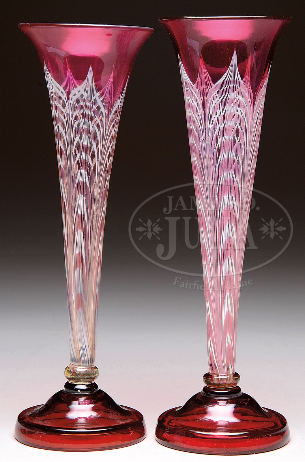PAIR OF DURAND VASES. Durand vases have peacock feather design in white and pink against a clear to flashed cranberry background. Unsigned. SIZE: 14″ t. CONDITION: Very good to excellent. 5-67842 (800-1,200)