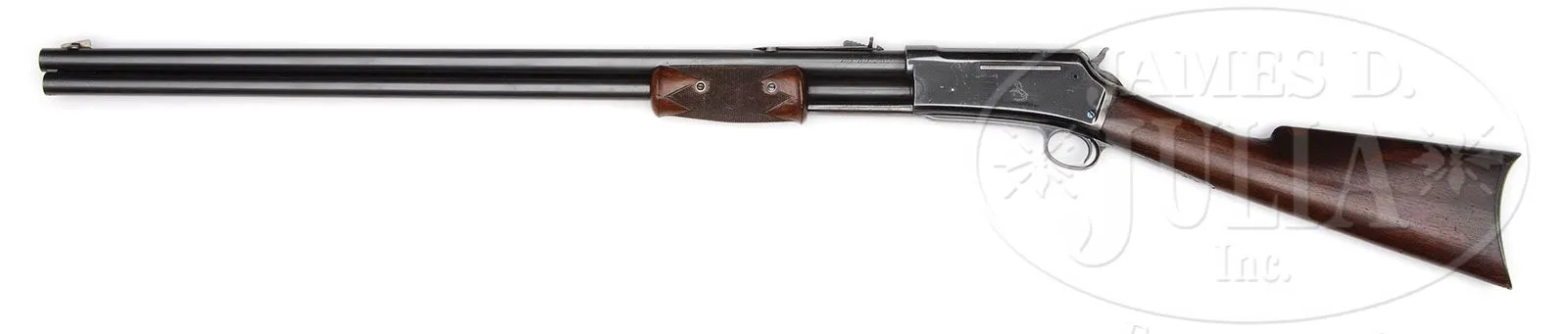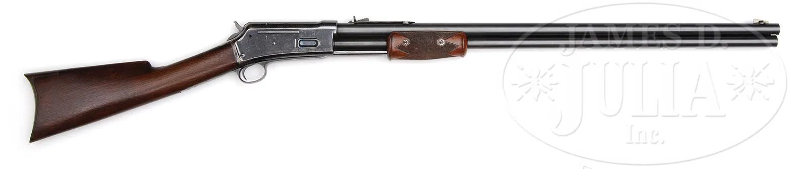 SCARCE LARGE FRAME COLT LIGHTNING SLIDE ACTION RIFLE. SN 1270. Cal. 45-85-285. Standard grade rifle with 28″ rnd bbl, full mag, German silver Rocky Mountain front sight and semi-buckhorn rear sight that has been filed flat on top. Left side of frame has the Rampant Colt logo. Mounted with straight grain American walnut that consists of a checkered, 2-pc, double schnable forearm and uncheckered straight stock with crescent buttplate. According to Flayderman’s Guide to Antique American Firearms, only 6,496 of these scarce rifles were produced in the period 1887-1894 as compared to the nearly 90,000 rifles each produced for the medium and small frame Lightning rifles. Consignor states that only about 1000 large frame rifles were produced in this caliber. Then comparing the small number of large frame Lightning rifles to the numbers of Winchester Models 1886 and the Marlin models 1881 and 1895, which all numbered into the hundreds of thousands, one can understand just how rare the large frame Lightning really is. CONDITION: Fine to very fine. Bbl and mag tube retain about 98% strong orig blue with faint muzzle edge wear and a couple of minor nicks. Receiver retains about 90% glossy orig blue with a few light nicks and scratches and some light flaking on right side with some light wear on right side. Top tang is a gray metal patina. Buttplate is a dark plummy brown patina. Stock has a hairline back of bottom tang and another in the toe with two small filled chips by the top tang at the receiver, otherwise wood is sound with a few light nicks and scratches and retains most of its orig factory finish, showing light wear around the wrist. Mechanics are fine, brilliant shiny bore. 4-47340 JR157 (6,000-10,000)