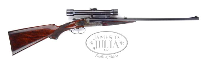 *JOH. SPRINGER SIDE PLATED EJECTOR DOUBLE RIFLE WITH ORIGINAL SCOPE AND CASE. SN 10479. Cal. 8 x 57JR. Double triggers, both set. Automatic safe. This beautiful little rifle has 22-3/4″ chopper lump bbls, engraved “Joh. Springer’s Erben” on right bbl. and “Gewehrfabrikanten, Wien” on the left. Nicely matted top rib has bases for Tyrolean-type scope mount, rear sight w/ one standing, 1 folding leaf, and transversally dovetailed front sight on raised ramp in front. Muzzles are engraved w/ acanthus and scroll. Breeches are engraved w/ decorative band. Rear portion of rib has scroll engraving. Bottoms of bbls have SN “10479” engraved on the flats along w/ Vienna proofs for 1934. Bottoms of bbls have other Vienna proofs and are marked “Boehler Spezial.” Number “13553” is stamped on the splinter. Case hardened side plated boxlock action has dual under lugs, Purdey hidden third fastener, and bushed strikers. Side plate & action have 80% coverage of beautifully executed floral scroll in Springer’s house style. Floor plate is engraved “J. Springer’s Erbin Gewehrfabrikanten, Wien”. “Safe” is inlaid in gold on top tang. Nicely figured and streaked full pistol grip European walnut buttstock measures 14-1/2″ over a ribbed, horn butt plate, and features a shadow line cheek piece for right handed shooter, horn grip cap, and 28 LPI checkering w/ mullered borders. Anson release splinter forend has script letter “P” in gold inlaid in central diamond. Wood and checkering to match buttstock. Drop at heel: 3″, drop at comb: 1-5/16″. Weight: 7 lbs 5oz. Weight w/ scope: 8 lbs 8oz. Scope is Zeiss Zielvier no. 47531 w/ 4 post and cross hair duplex reticle, engraved “Joh. Springer’s Erben, Wien” on the top. Austrian type mounts soldered to bottom. Front mount is stamped w/ SN. Orig leather cover is stamped “Zielvier.” Oak and Leather CASE has brass corners, dual locks and is embossed “Frederick F. A. Pierson, Sulby Hall, Rugby” on the lid. Interior is lined in green cloth, and contains a Springer marked oil bottle. PROVENANCE: Dr. Frank Miller Collection. CONDITION: Excellent. Bbls retain 98% orig blue. Action retains 95%+ orig case color, silvering on beads, outer edges of fences, and a bit thin on bottom toward forend. Trigger guard retains virtually all of its blue. Top lever and safety button silvering a bit from use. Stocks retain virtually all their original oil finish w/ a few scattered nicks and dings. Action is tight. Bbls are on face. Ejectors are in time. Bores are bright and shiny, w/ slight frosting towards breeches. SCOPE retains virtually all its original blue w/ few light scratches. Optics are slightly fogged. CASE: Leather has a few marks and scuffs. Interior partitions are tight. Cloth is excellent. 4-35646 MGM72 (12,000-15,000)