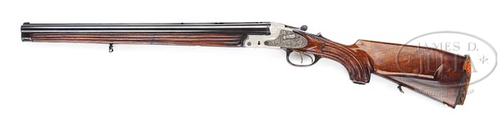 *SEMPERT & KRIEGHOFF NEPTUN SIDELOCK FULL STOCK DRILLING WITH DURAL FRAME. SN 17413. Cal. 16 X 16 X 7 X 57R. This very unusual prewar combination gun has 21-3/4″ bbls with raised, matted rib, pop-up rear sight, and Krieghoff style scope bases, are engraved “Sempert & Krieghoff Suhl.” on tops. Bottoms of bbls are marked with German and Birmingham nitro proofs for 2-3/4″ chambers. Rifle bbl has German and English proofs, and German proof date of 12/ 35. Breech area of rifle bbl is stamped “7 X 57 R”. Dural (aluminum) action features Krieghoff push forward rifle cocking lever on top tang, gold-plated double triggers (front one set), Greener crossbolt third fastener, and bushed strikers. Sidelocks have steel plates, raised rib tumbler end cocking indicators, and safety lever on left side. Action is engraved with acanthus scroll and stippled background. Fences show acanthus and flower motifs in high relief. Bottom of action is engraved “Krieghoff Drilling” and “Neptun Standard” in ribands. Lockplates are deeply relief engraved with vignettes of game – a bugling stag and 3 hinds in woodland on right plate, and roebuck with doe and 2 fawns in pastoral setting on left plate. Trigger guard is of horn. Fiddleback figured, and lightly streaked European walnut full pistol grip buttstock measures 15″ over remnants of pad, and features Bavarian style right hand cheekpiece, steel cartridge trap on toe line, and horn grip cap with engraved steel top that has monogram “JW” inlaid in gold. Instead of checkering, grip has 4 carved flutes on each side, running from grip cap toward lockplates with stippled borders. Two piece forend continues the fluted theme with 11 flutes running all the way to horn, slightly schnabeled,cap. Front piece is attached to bbl by the sling eye and loop. Removable portion of forend has Deeley release and horn washer where it joins front piece to forend. Bore diameter: left -.675, right -.675. Bore restrictions: left -.023, right -.030. Wall thickness: left -.036, right -.042. Drop at heel: Approx 3-1/8″, drop at comb: Approx 1-5/8″. Weight: 7 lbs. 1 oz, LOP 15″. CONDITION: Excellent. Bbls retain virtually all of high quality British re-black. Action retains virtually all of its silver anodized finish. Lockplates retain all of their French gray. Stocks retain nearly all of their original oil finish with grain lifted somewhat, and a number of marks from handling and use. Factory/orig Pad has collapsed, and needs replacing. Action is tight. Bbls are on face. Bores are excellent. A very finely made gun in an unusual configuration and finish, probably one of a kind. 4-38992 MGM142 (15,000-25,000)