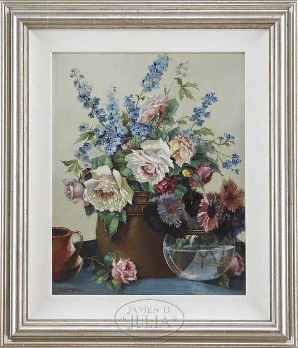 LAURA COOMBS HILLS (American, 1859-1952) STILL LIFE OF FLOWERS. Oil on canvas still life of flowers shows a brass jardiniere filled with colorful blue, white & red flowers alongside a clear glass round bowl with colorful aster-type flowers. Two roses are on the tabletop along with a copper vase. Signed lower left. SIZE: 18-1/2″ x 15″. CONDITION: Recently cleaned, some inpainting, very good. 9-24593 (2,500-3,000)