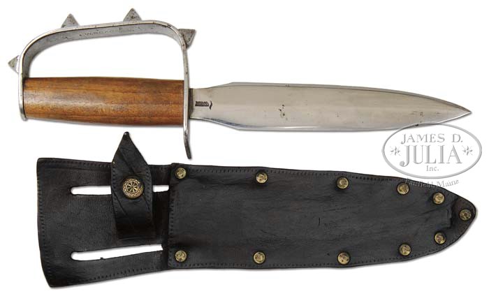 RARE SCAGEL MADE D-GUARD FIGHTER, ONE OF ONLY 6 EVER MADE BY SCAGEL. This D-guard fighter is one of only 6 ever made by Scagel. It was ordered and purchased directly from Scagel at his shop by a Marine in 1942 during World War 2. During the Marine’s tour of duty, he came home on bivouac and ordered 5 more from Scagel to bring back with him to Korea to give to some of the men in his platoon. Scagel had no idea of whatever happened to these other 5 following the war. The knife is overall 11-1/2″ in length, with a blade length of 7″. It has Scagel’s name stamp and Kris stamped on the blade, and has his large block lettered name “W.SCAGEL” stamped on the inside of the bail of the D-Guard. This knife is pictured on page 148 of the book, and also again in the 1996 Calendar in the month of July, the bottom image. It has a double dagger-ground blade. The handle is wooden, made from Michigan hard-rock maple. The Scagel-made sheath is in nice condition, is riveted with Milford brass rivets and has a brass pinwheel snap on the belt loop. The sheath is pictured on page 64 of the book in the lower right side. PROVENANCE: Dr. Jim Lucie Collection. CONDITION: Very close to being a mint, unused knife. The original grind lines are vivid, the stamps are clear, and there is no pitting. There are extremely few and light scratches and scuff marks on the blade. The sheath is in very fine condition, with only a slight 1/2″ tear on the throat opening. One of only 6 ever made. A wonderful rare example of one of Bill’s military fighting knives. 4-45554 JL34 (18,000-26,000)