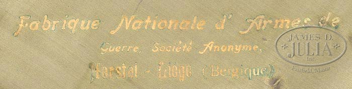 *RARE PRESENTATION CASED FN/BROWNING MODEL 1900 SEMI-AUTO PISTOL. SN 522408. Cal. 7.65mm (32 ACP) Blue finish with 4″ bbl, fixed sights and FN embossed hard rubber grips. It has usual slide markings on the left side with Browning’s patent on the left side of the frame. Accompanied by its original black leatherette covered, olive colored silk and velvet lined casing, French fitted in the bottom for the pistol. In the left front corner of the bottom it has a spare magazine in a recess with a screwdriver tool & steel cleaning rod in cloth retainers. Inside the lid is embossed in gold with the company’s name and address. This pistol is but another example of the Browning genius. In 1898, John Browning was approached by one of the managers of FN while visiting Winchester to discuss production. He gave FN a working bench model of what became the model 1899 pistol which had modest success with about 10,000 being produced 1899-1901. The Belgium military purchased a few of the models 1899 but requested improvements which led to the model 1900 which became the first semi-automatic pistol ever adopted by a national military. The model 1900 had great success which prevented the FN from going bankrupt. According to Randy Bessler, noted hand gun dealer, only a very few of these little pistols were factory presentation cased. CONDITION: Extremely fine plus, probably unfired. Overall retains virtually all of its original factory dark blue with only the most faint sharp edge wear. Mechanics are crisp, bright shiny bore. Case shows its hundred years of storage and handling with worn edges and a couple of spots of minor loss. Interior is lightly soiled and faded with some minor wear in the lid. 4-38065 JR274 (3,000-5,000)