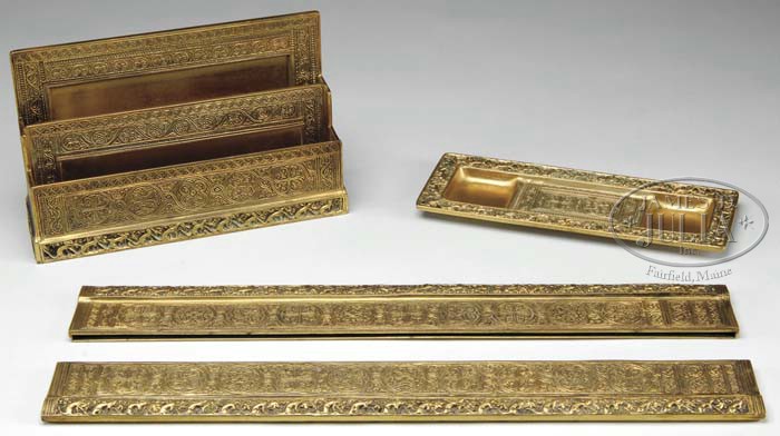 TIFFANY STUDIOS 3PC DESK SET. Beautiful Tiffany 3pc desk set in the Venetian pattern features a large paper rack, pen tray and large blotter ends. Each piece is finished in a rich gold patina which highlights the intricate Venetian design. Each piece is signed “Tiffany Studios New York” and numbered. SIZE: Blotter ends: 19-1/4″ l. Paper rack and pen tray: Each 10″. CONDITION: Very good to excellent with only very minor wear to patina. 5-62467 (1,200-1,500)