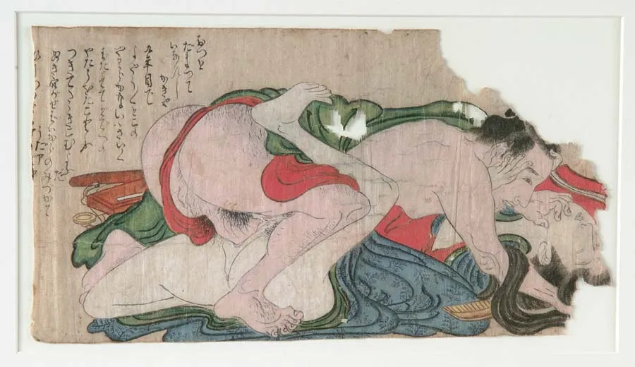 EROTIC JAPANESE (18TH CENTURY) PRINT. 18th Century Japanese woodblock print is hand colored with handwritten inscription. Print depicts man and woman in erotic position. Framed in contemporary black bamboo design. SIZE: 13-1/2″ x 19-1/2″ overall. IMAGE SIZE: 6-1/2″ x 12″. CONDITION: Some paper loss, typical of prints this age, otherwise very good. 5-71680-1135 (1,000-1,500)