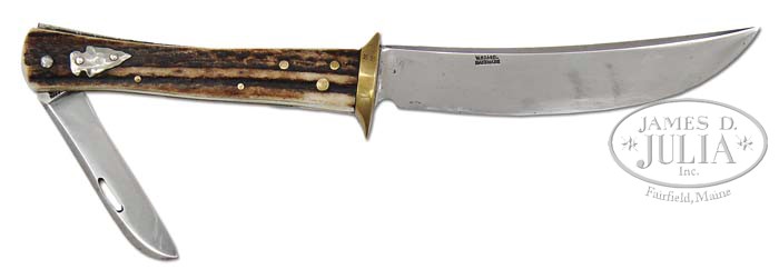 RARE AND DESIRABLE SCAGEL MADE FIXED BLADE HUNTER WITH A FOLDER BLADE IN THE HANDLE Vl&A MARKED. This is one of the most scarce and most difficult Scagel knives to obtain. Scagel made only 12 of these, and Scagel’s own photo taken by him with his Kodak folding camera depicts these 12 knives on page 98 of Scagel Handmade by James R. Lucie. This knife is the one pictured to the far right of Scagel’s photo. The full page photo of this knife is pictured on page 103 of the book, and is also the cover picture on the 1996 Calendar as well as the month of September. The overall length is 10-1/2″, with a fixed blade length of 5-1/4″, and the folder blade of 2-3/4″ length. Elk slabbed handle scales with brass rivets. Scagel’s silver arrow is affixed to the handle. Concerning this style knife, the reader is directed to the letter Scagel wrote to Bo Randall on September 21, 1939, in which Scagel admonishes Bo as to how difficult it is to make this style knife and that he (Bo) should “try to make one”. This letter is reproduced on page 221 of Scagel Handmade by James R. Lucie. This author/owner has over the years been privileged to see 9 of the 12 knives made, and this one is the finest condition of them all. There is no sheath for this knife. Super rare knife! PROVENANCE: Dr. Jim Lucie Collection. CONDITION: Used very little and near mint. There are a few light superficial scratches on the fixed blade. The handle and small folder blade are mint. Absolute centerpiece for any Scagel collection. 4-45566 JL38 (20,000-30,000)