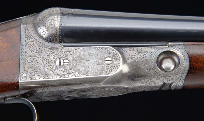*RARE PARKER CHE GRADE DOUBLE BARREL SHOTGUN THAT BELONGED TO L.L. BEAN. Cal. 16 ga. SN 236202. Built on a No. 1 frame with 26” Acme Steel bbls choked FULL/MOD with tapered, concave, matted rib, dbl ivory beads, doll’s head rib extension, ejectors & Parker sgl selective trigger. Mounted with very nicely figured, extra slim, checkered American walnut with splinter forearm & pistol grip stock with raised teardrop side panels, 14” over an old Hawkins red waffle pad. Receiver is engraved in typical “C” patterns with a bird dog on each side and a large flying goose in a marsh scene on floorplate. Bottom of stock has a silver initial oval engraved “LLB”. Accompanied by a letter from Herschel Chadick, well-known high grade shotgun dealer, to a previous owner dated Feb. 19, 1992. Mr. Chadick states that he purchased this shotgun from a collector who had owned it for a number of years. This cataloguer has personal direct knowledge of this shotgun, having financed its purchase by the late Larry Higgins of Auburn, Maine from an old Vermont family back in the mid to late 1980’s. It has remained in limited circulation until now, having just emerged from another fine collection. The consignor purchased it directly from the addressee of the above letter. Bore diameter: left – .664, right – .664. Bore restrictions: left – .025, right – .009. Wall thickness: left – .023, right – .018. Drop at heel: 2-1/8”, drop at comb: 1-5/8”. Weight: 6 lbs. 6.08 oz. CONDITION: Very fine. Bbls retain 95-96% strong, orig blue with some thinning and a small chemical spot at the muzzles with slight thinning, a couple of nicks and a spot of pitting over chamber areas. Right bbl appears to have had a small dent removed about mid-point. Receiver retains 50-60% faded case colors with balance turned silver. Wood is sound having been cleaned, but does not appear to have been refinished. Mechanics are crisp, very bright shiny bores. 4-31130 JR482 (25,000-40,000)