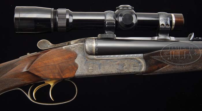 *JOHN OUTSCHAR’S SOHN FERLACH BOX LOCK EJECTOR RIFLE WITH SCOPE. SN 35 3052. Cal. 458 Win Mag. 26-1/2″ Chopper lump steel bbls are engraved “Joh. Outschar’s Sohn – Ferlach – Austria” on one piece matted rib with cross bolt extension. Raised rear portion has claw mount bases for scope and one standing, two folding express sight with gold lines marked for 50, 100, and 200 yards. Silver bead front sight is longitudinally dovetailed into raised portion at front of rib. Bbl flats show Ferlach proofs. Bottoms of bbls are marked “Bohler RASANT” with Ferlach proofs, caliber, and “M” in logo with SN and “JO” in oval. Bottom of rib is stamped with importers mark “Champlin Firearms Inc. Enid, OK.” and has sling eye installed with screws. QD sling swivels are present. Scalloped back, case hardened, box lock action features double triggers [front articulated]. Greener cross bolt, bushed strikers, and non-automatic safety. Water table has Ferlach proofs and SN. Action and floor plate show 60% coverage of scroll engraving. “S” is inlaid in gold on top tang. Trigger guard has scroll and extends to steel trap grip cap. Figured and lightly streaked full pistol grip European walnut buttstock measures 14-1/4″ over Silvers type pad with right hand shadow line cheek piece, sling eye, and 20 LPI checkering with line border. Triggers are gold plated. Deeley release semi-beavertail forend has wood, checkering and engraving to match rest of rifle. Leupold Vari-X III 1.5 x 5 scope with duplex reticle is in claw rings engraved to match rifle. Drop at heel: Approx. 3-1/8″ , drop at comb: Approx. 1-7/8″. Weight: 11lbs. 7oz. CONDITION: Excellent, near new with a few minor nicks and dings from use. Grip area of trigger guard shows some staining. Couple diamonds are missing from checkering in forend. Bores are excellent. Action is tight. Bbls are on face. Ejectors are in time. Scope has a few minor marks and dings. Optics are clear. 4-38696 MGM4 (15,000-20,000)