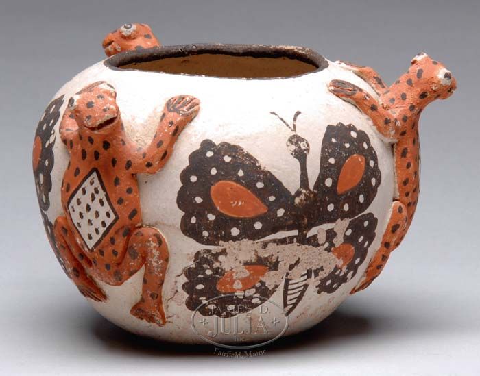 NATIVE AMERICAN POLYCHROME DECORATED BOWL WITH THREE APPLIED LIZARD HANDLES. Of globular form, painted with dark brown stylized butterflies, alternating with three spotted applied lizards. PROVENANCE: Fine private Long Island, New York mansion. SIZE: 4-1/2”h, 6-3/4” dia. CONDITION: With loss to glaze, chip in base rim, deterioration of pottery with crack on side. 9-73965 SM (500-800)