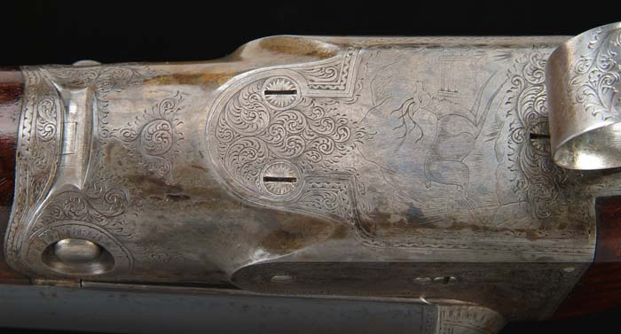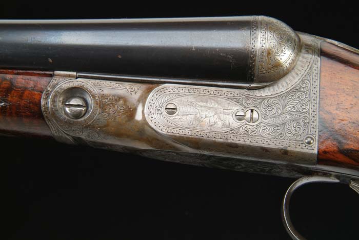 *PARKER CHE GRADE DOUBLE BARREL SHOTGUN. Cal. 12 ga. SN 153908. Built on a No. 2 frame with 30” Acme Steel bbls choked FULL/FULL with tapered concave matted rib, doll’s head rib extension, automatic ejectors & dbl triggers. Mounted with spectacular, orig honey & chocolate, marble cake, carved & checkered French walnut with splinter forearm & straight stock with raised teardrop side panels, 14-1/8” over an engraved, skeleton buttplate with checkered center. Receiver is engraved with typical C-grade patterns with bird dog on each side and a running elk on trigger plate, surrounded by foliate arabesque patterns. Maker’s name is in a ribbon on each side. Will letter as found. Bore diameter: left – .733, right – .732. Bore restrictions: left – .038, right – .039. Wall thickness: left – .033, right – .030. Drop at heel: 2-3/8”, drop at comb: 1-7/16”. Weight: 8 lbs. .64 oz. CONDITION: Very fine. Bbls retain 92-93% strong orig blue with some thinning near the muzzles and over forearm area. Small ding on left bbl 3″-4″ down from muzzle.Receiver retains 60-70% thin orig case colors, fading to silver. Wood is sound with usual handling & use marks and a few scattered bruises & scrapes and retains most of its orig varnish finish on buttstock with forearm a hand worn patina. Mechanics are crisp, bright shiny bores with a small amount of very fine roughness in right side, just above chamber. A really beautiful, well cared for Parker. 4-30570 JR347 (9,000-12,000)