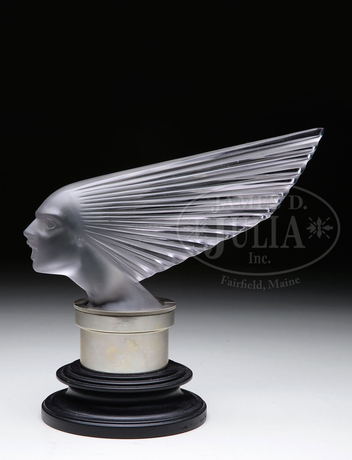 R. LALIQUE VICTOIRE MASCOT. R. Lalique mascot in the Victoire pattern is done in light amethyst tinted glass with frosted head and neck and clear headdress. Signed on the side in raised block letters “R. Lalique”. The mascot sets in a quality contemporary stand marked “Breves Galleries Knightsbridge S.W.3 Pat. No. 309301”. Marcilhac 1147, pg. 502. SIZE: 10″ l x 8-7/8″ t, in stand. PROVENANCE: From a prominent Georgia collection. CONDITION: Very good to excellent. 5-67601 (20,000-30,000)