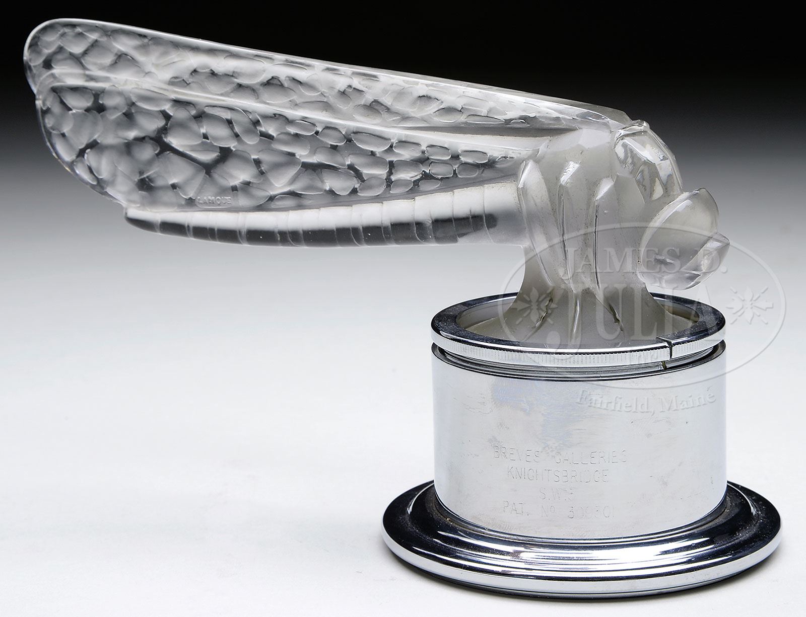 R. LALIQUE LIBELLULE MASCOT. R. Lalique mascot depicts a perched dragonfly with folded wings. The dragonfly has a frosted body with clear wings featuring frosted texture. The mascot is housed in a contemporary chrome stand which is marked “Breves Galleries Knightsbridge S.W.3 Pat. No. 309301”. Marcilhac 1144, pg. 501. SIZE: 6-1/4″ l x 4″ t, including stand. PROVENANCE: From a prominent Georgia collection. CONDITION: Very good to excellent. 5-67605 (7,500-10,000)