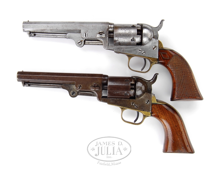EXTREMELY RARE DOUBLE CASED PAIR OF COLT MODEL 1849 PERCUSSION POCKET REVOLVERS. Cal. 31. Both revolvers are configured identically with 5″ oct bbls, brass pin front sights and 2-line New York City address with serifs. They have “COLTS PATENT” on left side of frames with brass grip frames and 1-pc walnut grips. Both have 5-shot cylinders and both have a small “2” above the serial number on bbl lugs. One has checkered grips. Accompanied by the extremely rare, very early, purple velvet lined, double walnut casing with beveled edge lid, mortised shield shaped lock escutcheon and a mortised brass lock. Inside lid has the Colt loading direction paper and the bottom is compartmented for the two revolvers with a large central compartment for a mold and flask. Corner compartments contain lead balls and a cap tin. Central compartment contains a Colt iron 2-cavity mold with sprue cutter marked on right side “31 PKT” and a small brass flask. CONDITION: 1) SN 71503. Fair, all matching including wedge. No orig finish remains with the steel being a smooth brown patina and the brass a medium dark patina with traces of orig silver. Grip is fine with edge wear retaining 92-93% orig varnish. Hammer spring is broken or missing as is the wedge spring, strong dark bore. 2) SN 71489. Good, all matching including wedge. Metal has been cleaned bright with battered hammer screw. Grip is checkered. Cylinder retains about 75% stagecoach holdup scene. Timing needs adjusting, otherwise mechanics are fine, strong bore, dark in grooves. Case is completely sound with slightly warped lid and warped rear edge. Interior is moderately faded and lightly soiled. An extremely rare double casing. 4-31636 JR272 (7,500-12,500)